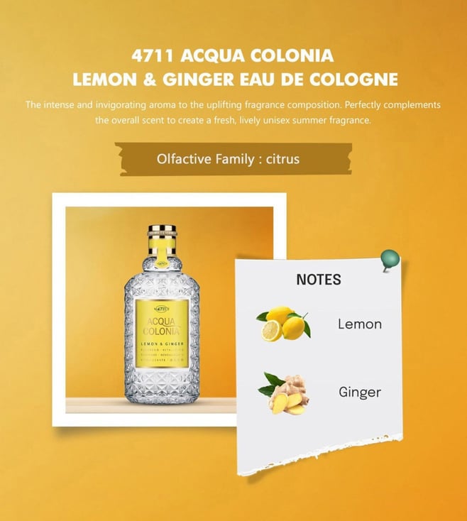 The intense and invigorating aroma to the uplifting fragrance composition. Perfectly complements the overall scent to create a fresh, lively unisex summer fragrance. This pack contains 4711 Acqua Colonia Lemon & Ginger Eau de Cologne - 170 ml and 4711 Acqua Colonia Lemon & Ginger Eau de Cologne - 50 ml.