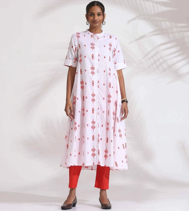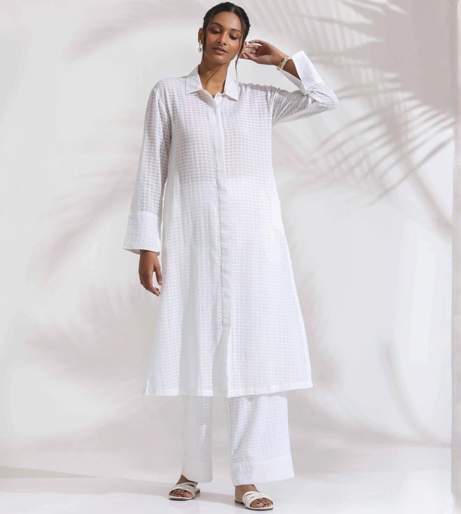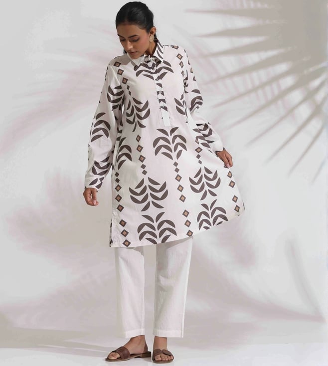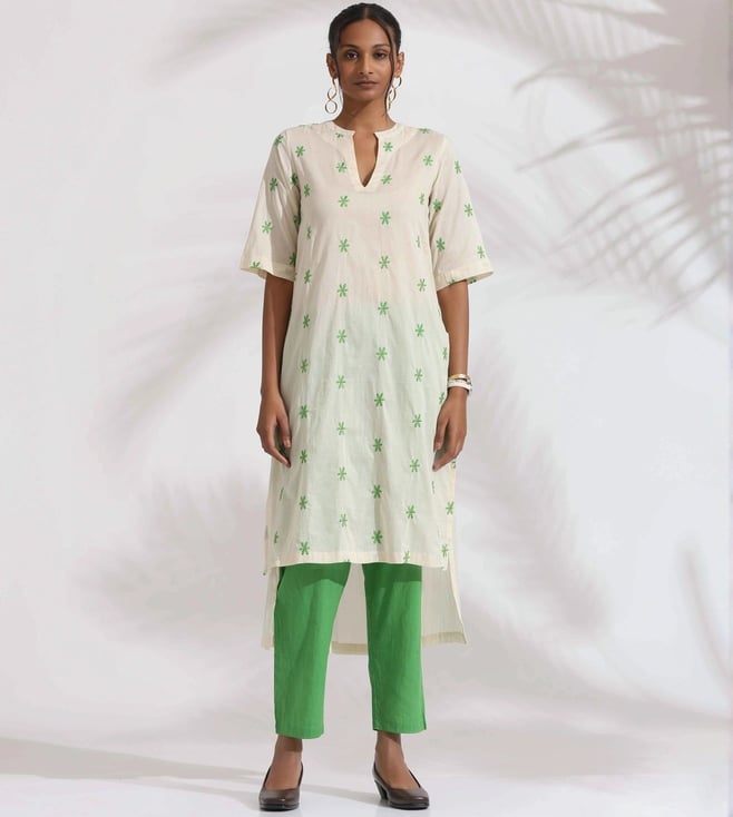 Off-White Cotton Floral Embroidered Straight Kurta Set