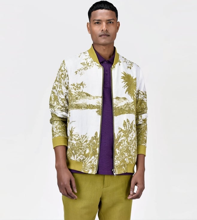 Bright Olive Linen Comfort Fit Printed Bomber Jacket