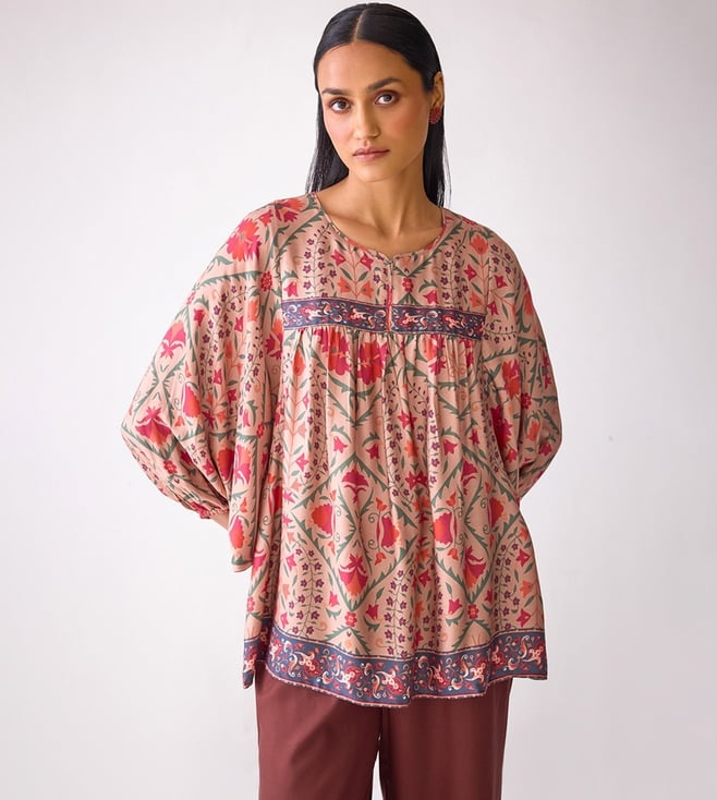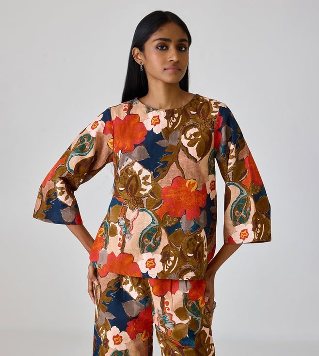 Multi Cotton Linen Print 3/4Th Sleeve Top