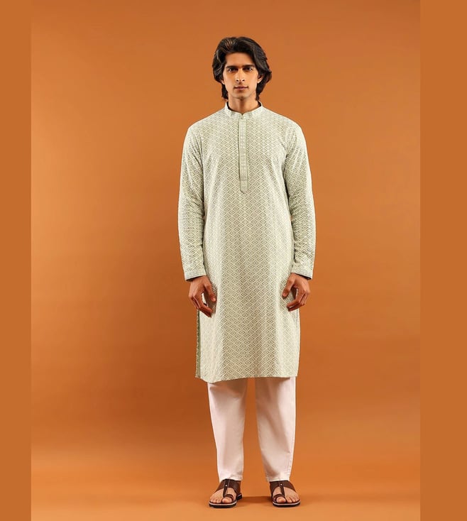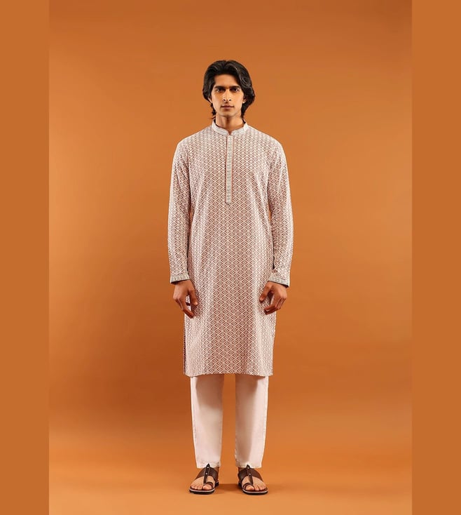 White & Brown Cotton Nasir Cotton Straight Men's Kurta