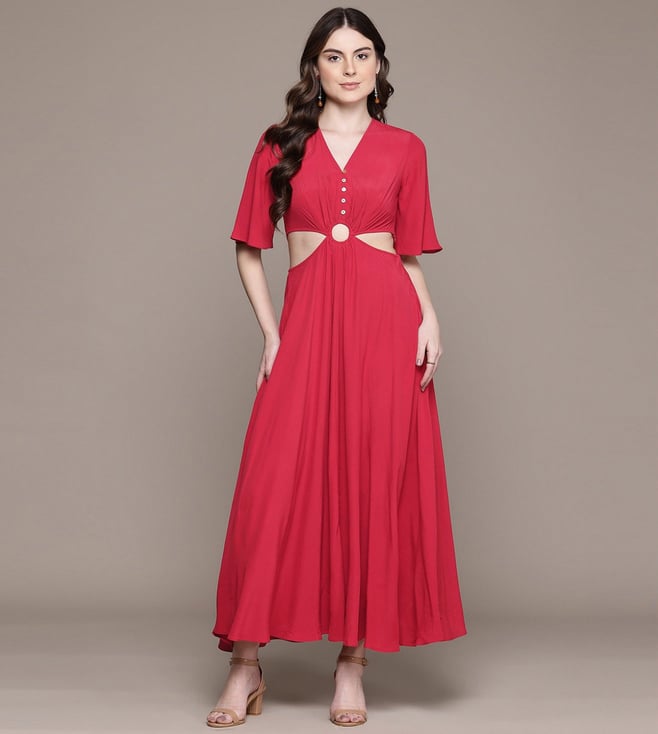 Red Silk Crepe Regular Fit Embroidery Casual Dress