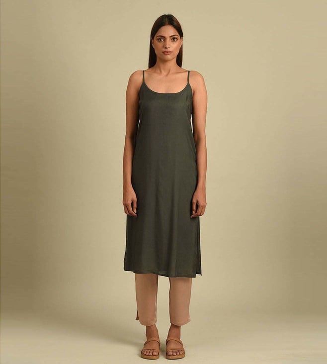 Olive HOC Crafts Aari Embroidered Woollen Solid Women's Long Kurta