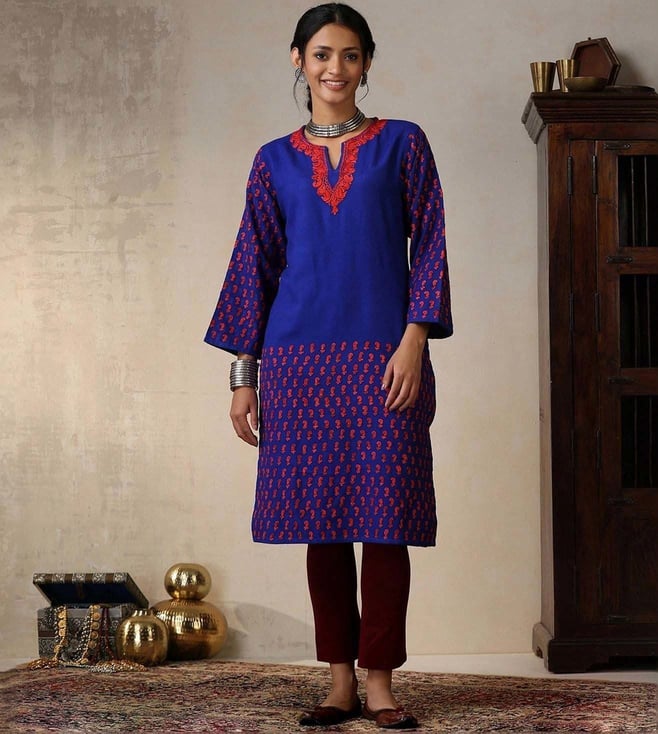 Royal Blue HOC Crafts Aari Embroidered Woollen Solid Women's Long Kurta