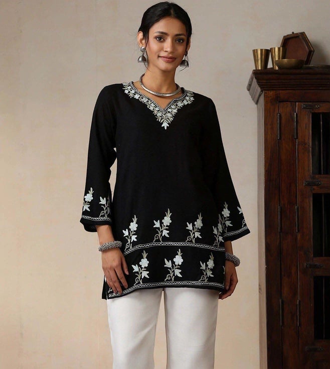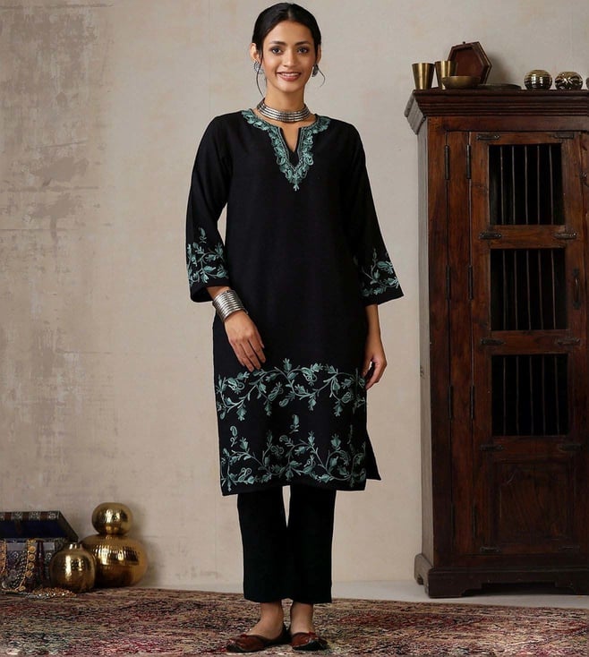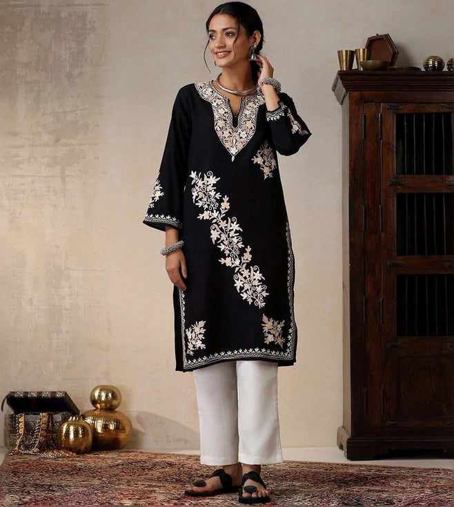Black HOC Crafts Aari Embroidered Woollen Solid Women's Short Kurta