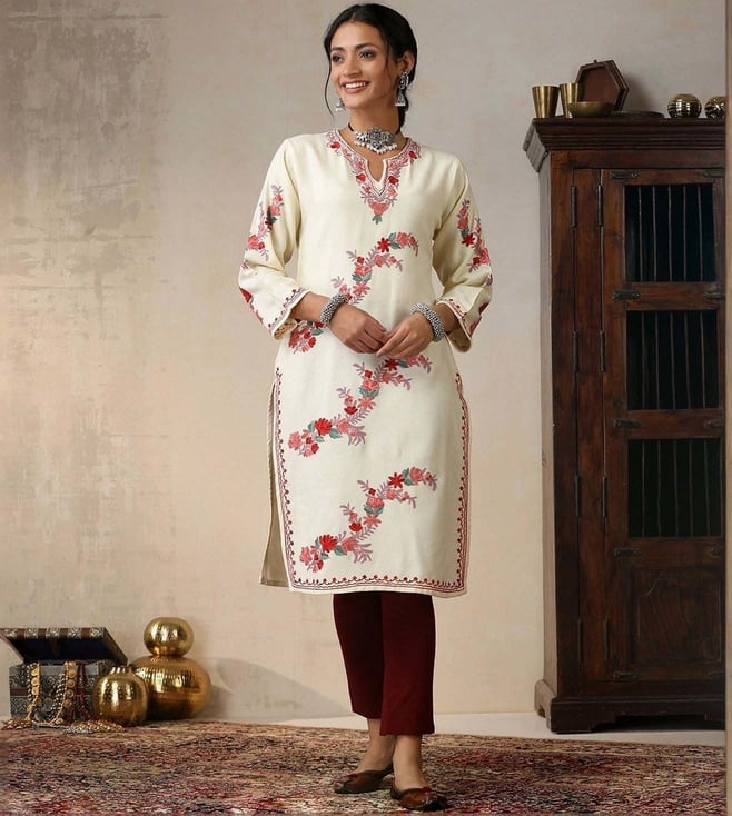 Beige HOC Crafts Aari Embroidered Woollen Solid Women's Long Kurta