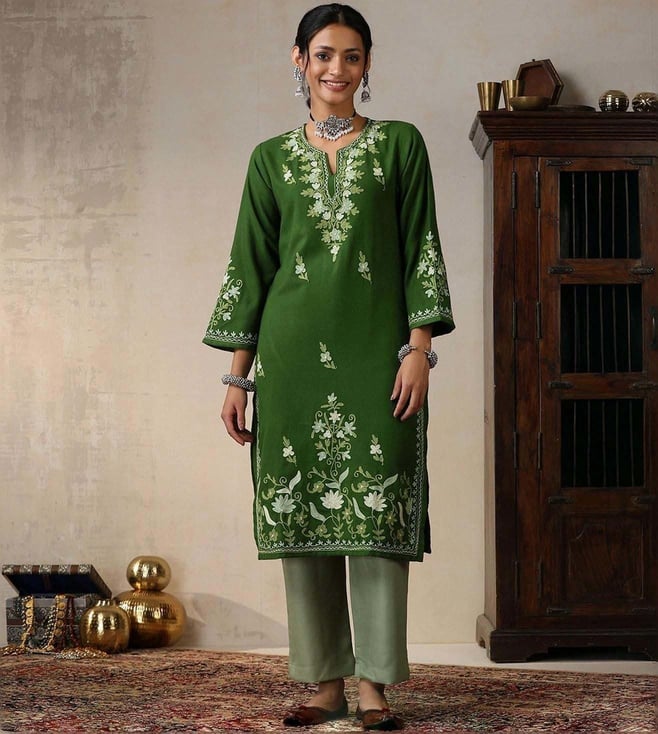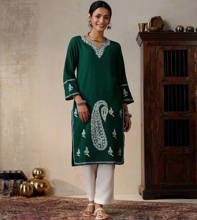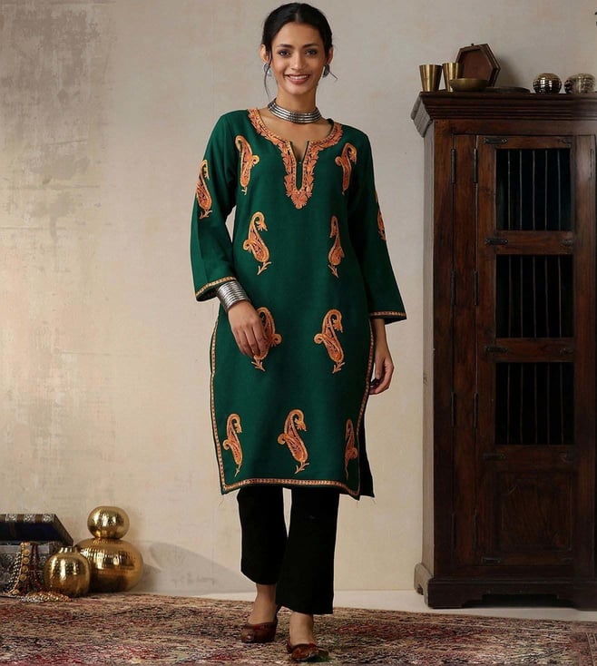 Green HOC Crafts Aari Embroidered Woollen Solid Women's Long Kurta