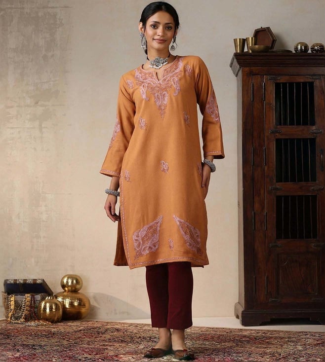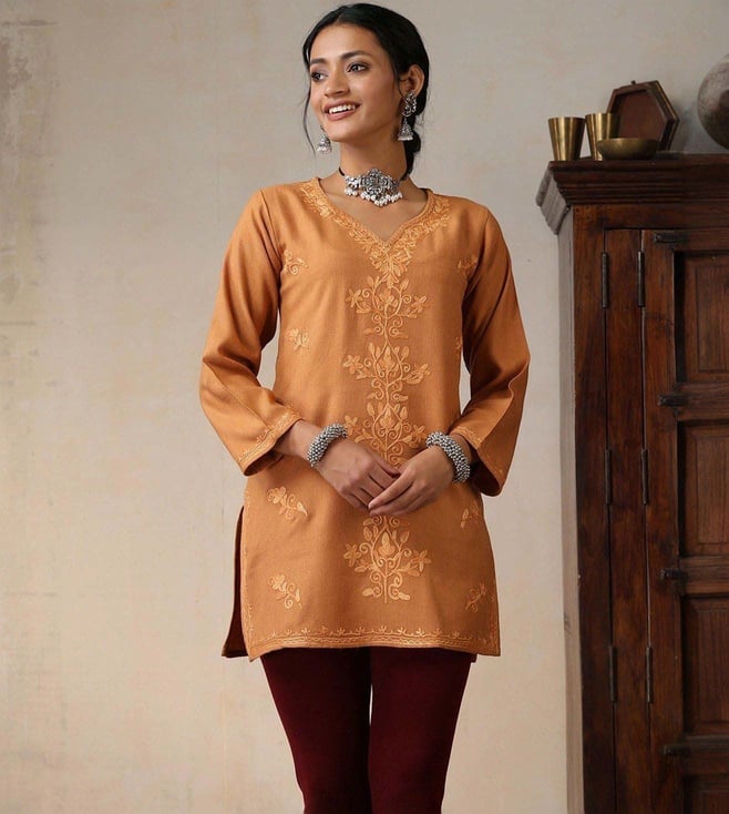 Rust HOC Crafts Aari Embroidered Woollen Solid Women's Short Kurta