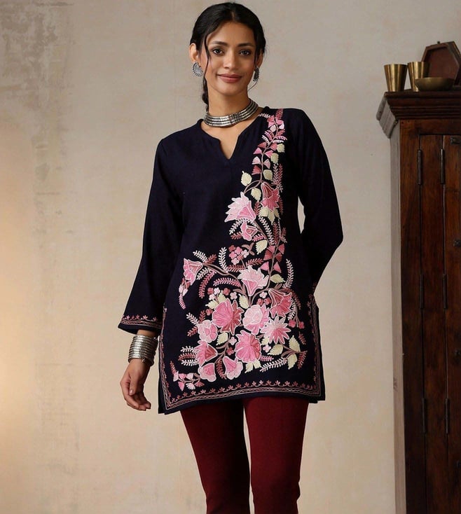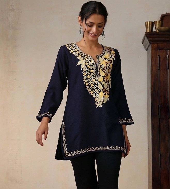 Navy Blue HOC Crafts Aari Embroidered Woollen Solid Women's Short Kurta