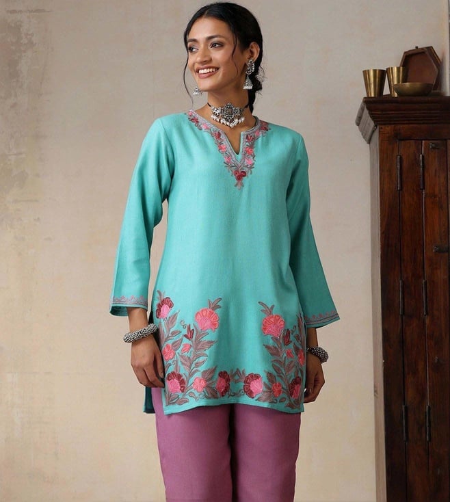 Teal HOC Crafts Aari Embroidered Woollen Solid Women's Short Kurta