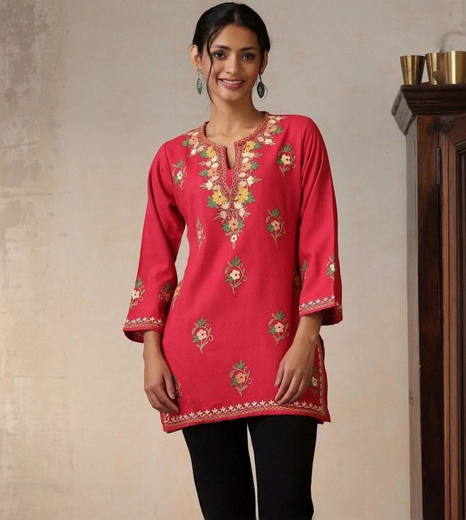 Pink HOC Crafts Aari Embroidered Woollen Solid Women's Short Kurta