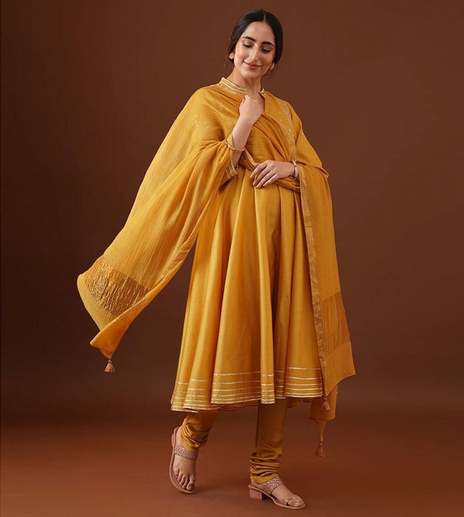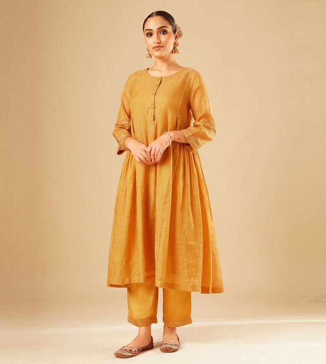 Women Mustard Yellow Gota Patti Flared Fit Kurta