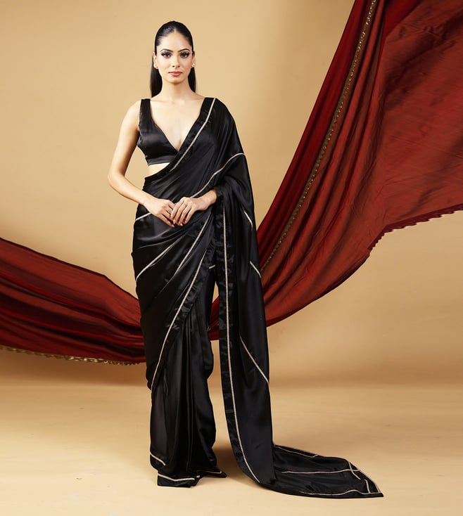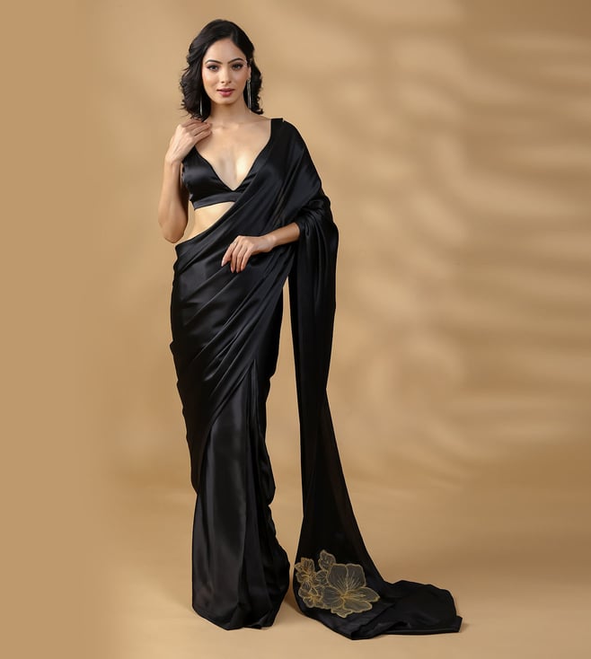 Black Satin Pre Draped Saree With Blouse