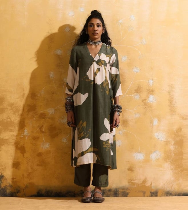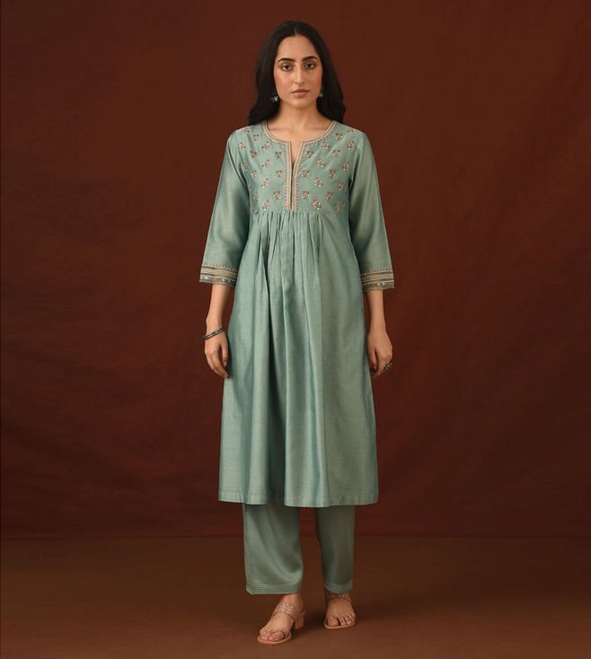 Green HOC Crafts Woollen Aari Embroidered Solid Women's 2 PC Long Kurta Set