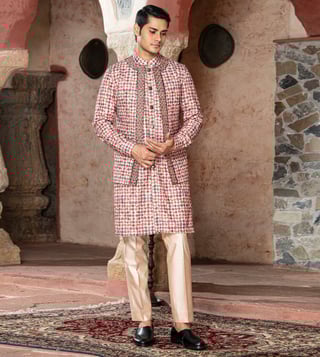 Abkasa's Ivorienne Pink Kurta with a full-sleeved Jacket for men is crafted using a cotton-poly blend and makes for a perfect ethnic wear. Anchor your look with sophisticated vibes by teaming this timeless classic. Disclaimer: All other items in the image are only for display purposes and will not be a part of the delivery content. Product colour may slightly vary due to photographic lighting sources. Country of Origin - India.