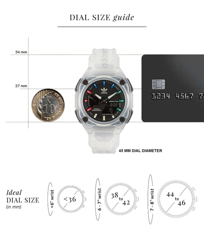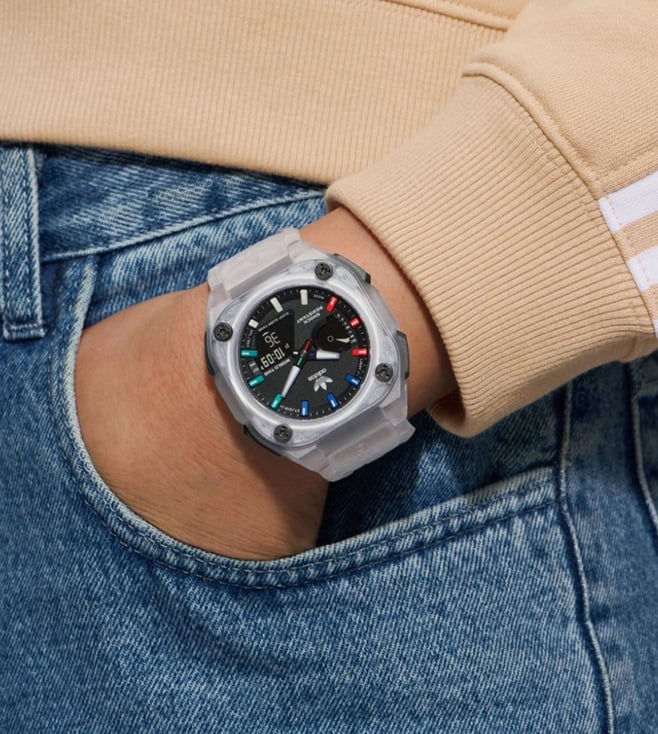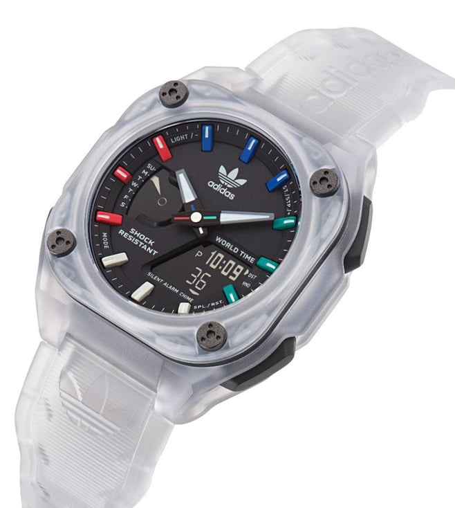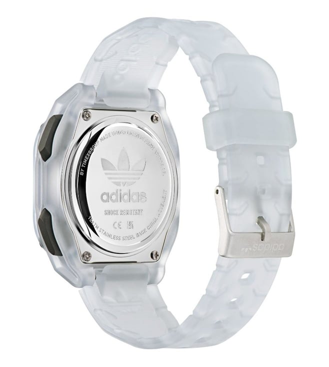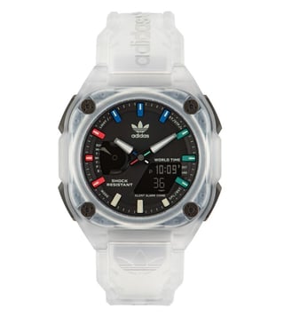 Bring a new dimension to your wrist with this unisex's analog-digital watch from ADIDAS ORIGINALS. The black octagon dial is protected by a mineral glass. It has a crown for time adjustment. The resin strap comes in a white hue that further elevates the look of the timekeeper. Besides, it is completed with a pin buckle clasp to ensure a secure fit on the wrist.