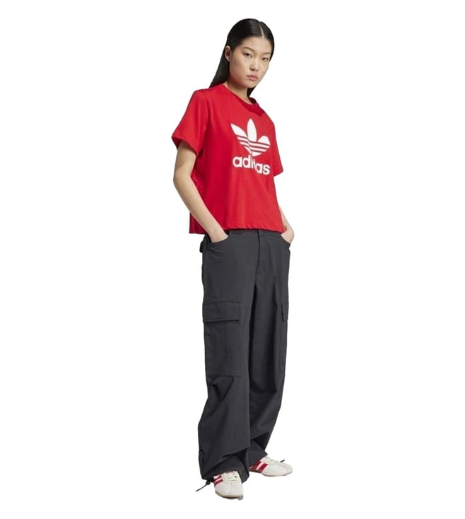 Remold the definition of cosmopolitan charm by wearing this pair of black regular fit trousers from Adidas Originals. Tailored to sartorial perfection from premium quality fabric, it assures a soft and soothing touch against the skin.
