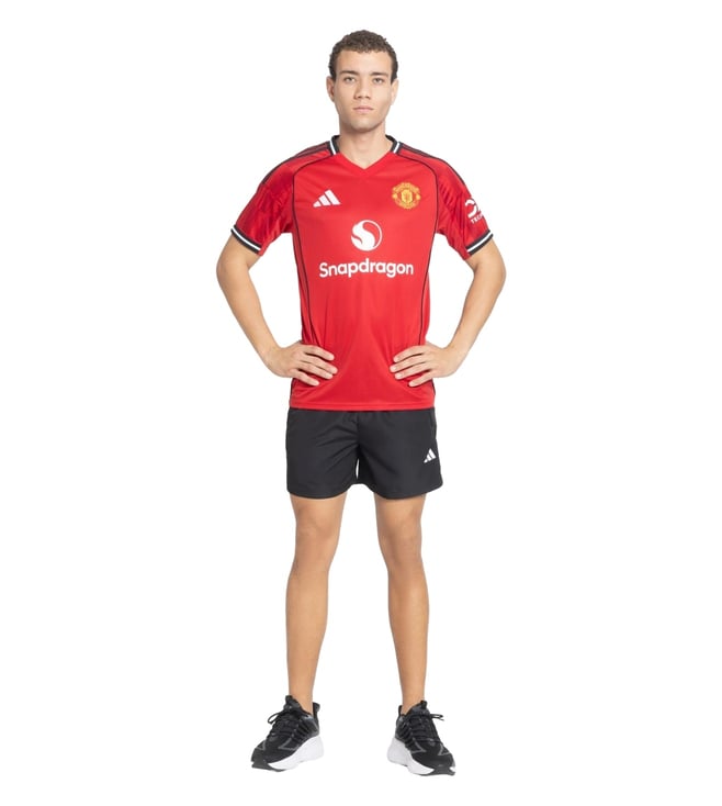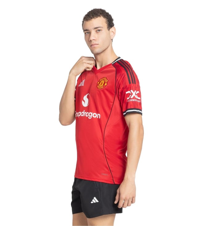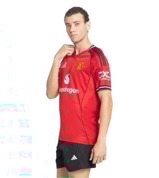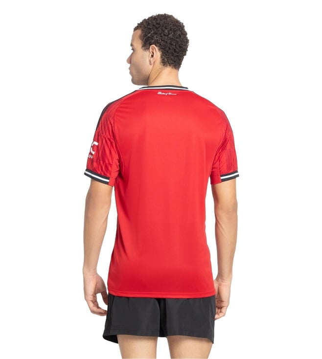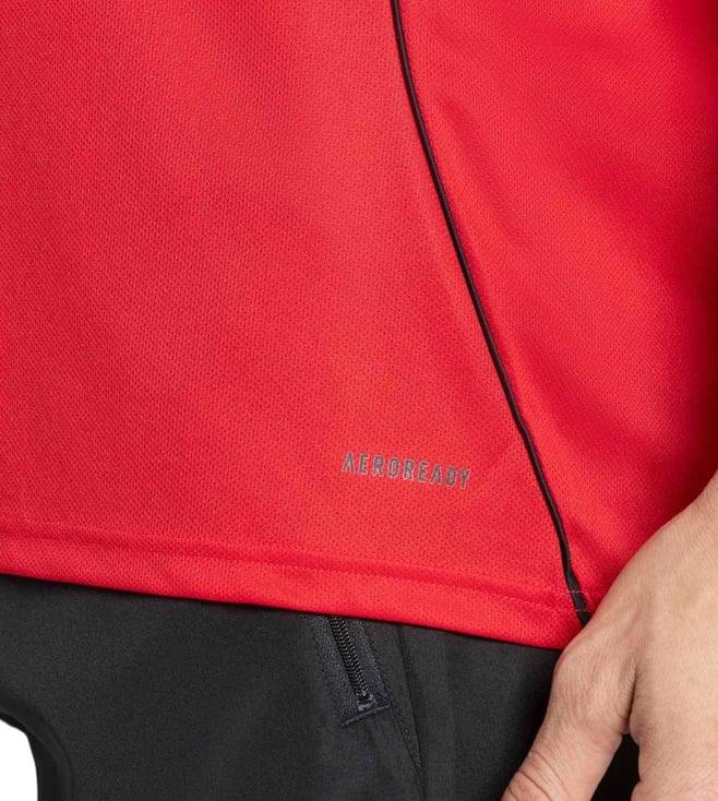 Amp up your wardrobe with this red slim fit jersey from adidas. Tailored to sartorial perfection from premium quality fabric, it assures a soft and soothing touch against the skin. The V-neckline adds to its appeal. Exuding short sleeves, it is sure to fetch you compliments from all. The printed pattern makes it a captivating choice.