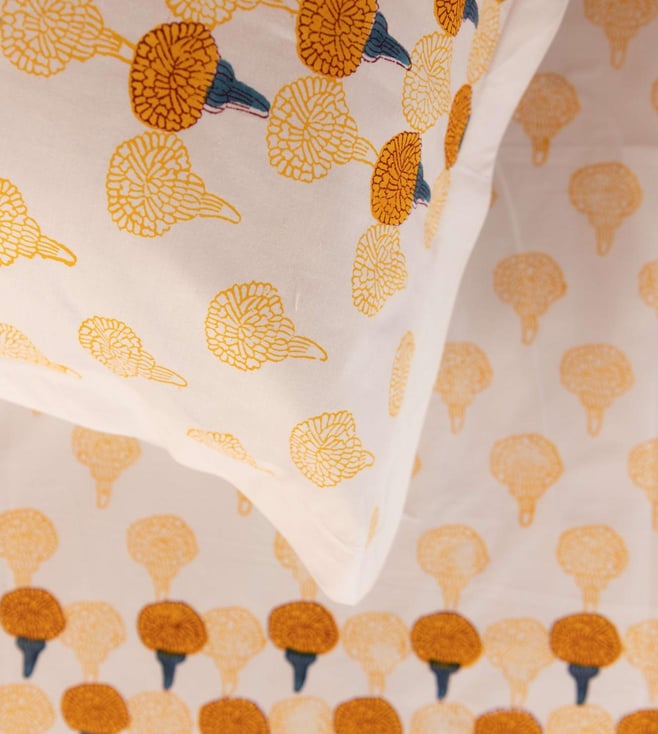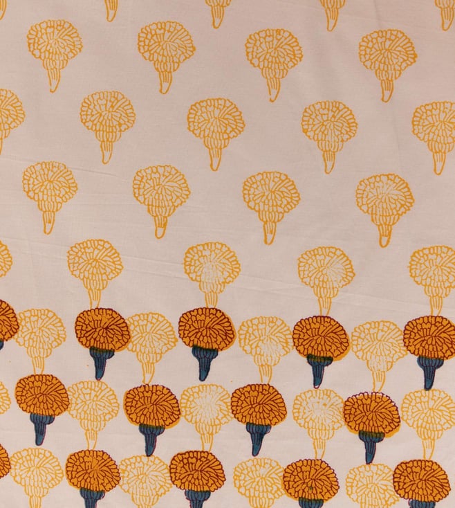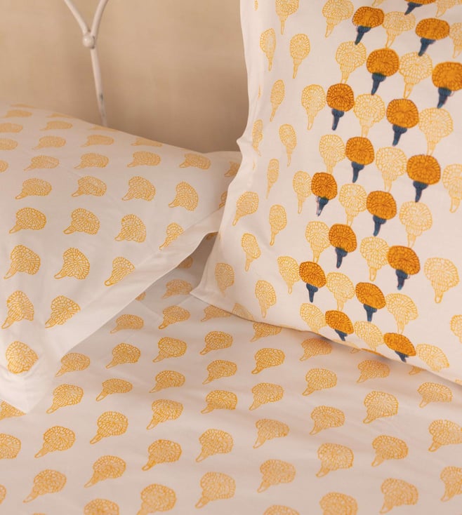 Indulge in the embrace of this cosy and stylish bedsheet. It is made using premium-quality cotton. It is intricately hand-block printed with contemporary marigold flowers. It comes with two hand-block printed pillow covers. Disclaimer: All other items in the image are only for display purposes and will not be a part of the delivery content. Product colour may slightly vary due to photographic lighting sources. Country of Origin - India.