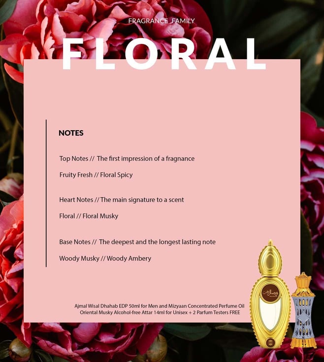 Spread positive vibes around with this EDP and attar from Ajmal & Sons. The EDP is perfectly crafted for those who wish to add an extra touch of gold and shimmer to their persona. The fragrance opens with fruity fresh top notes embellished with apple, peach, pear, grapefruit and mandarin. At its heart, the essence engulfs floral highlights of rose, jasmine, orchid and geranium. The attar is a unisex offering designed for individuals who are vibrant and have beaming personalities. It is designed around floral spicy notes with saffron that gives the scent its oriental charm.