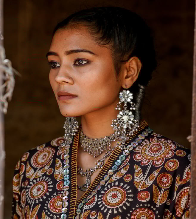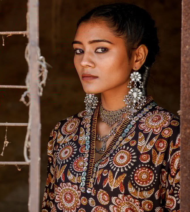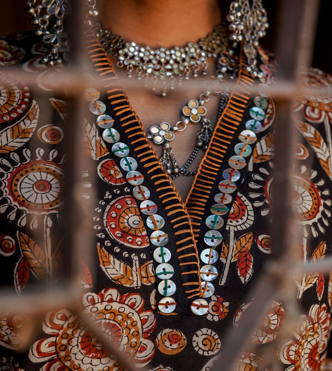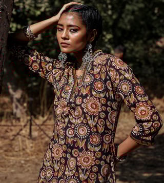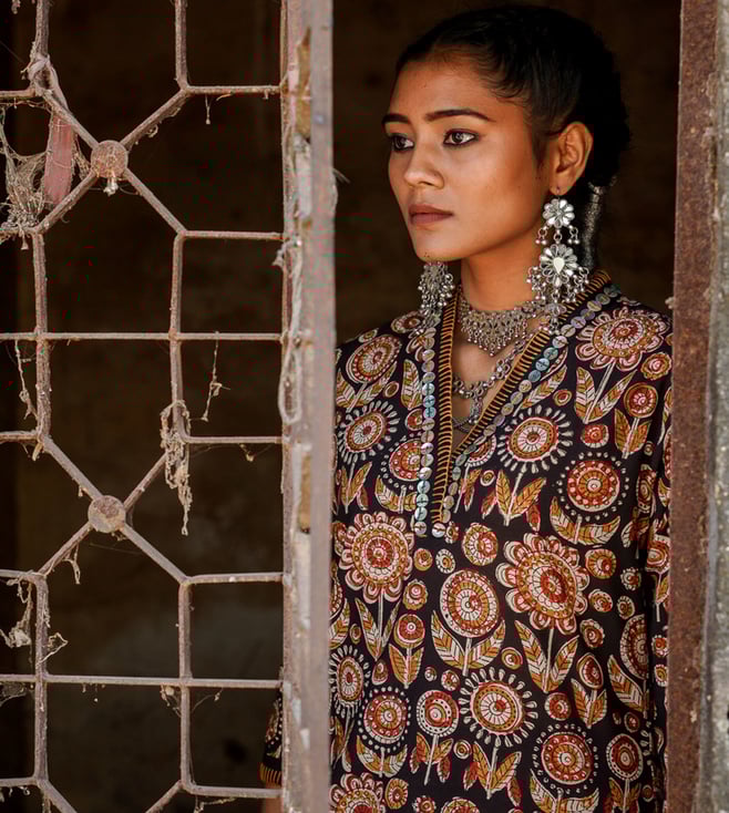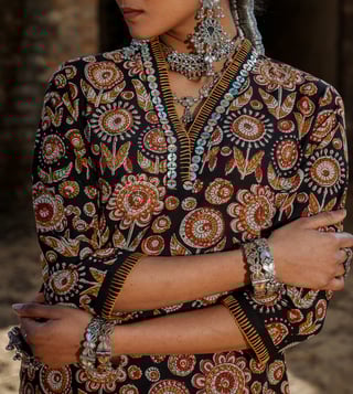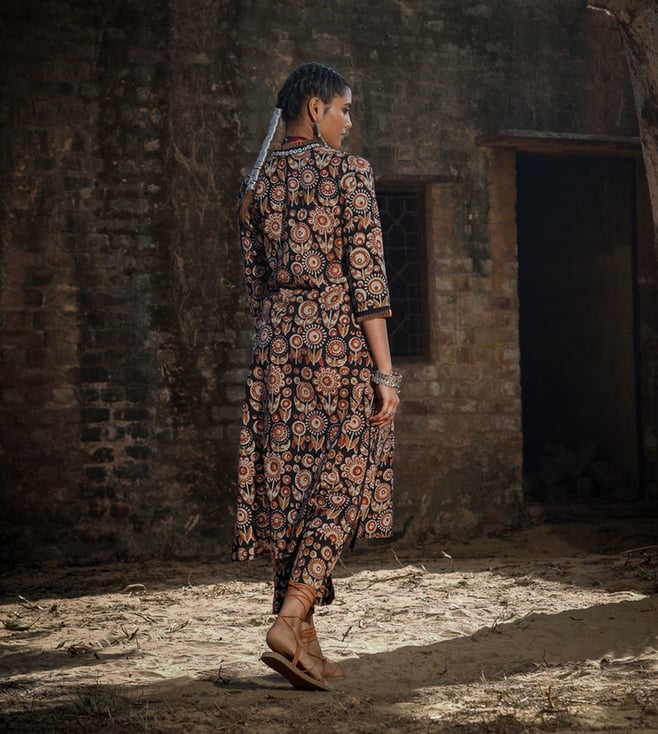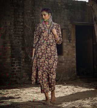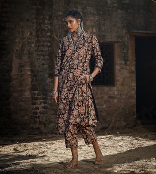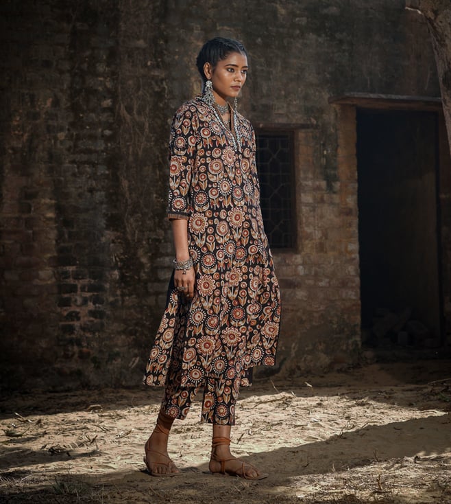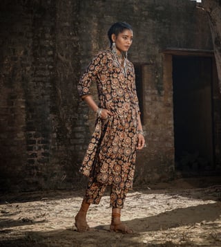 Stay stylish this summer with Akiso's Block Printed Black Kurta and pants set. Made with 100% cotton and hand-embroidered detailing, this set is perfect for any occasion. Available for women and by Akiso.' Disclaimer: All other items in the image are only for display purposes and will not be a part of the delivery content. Product colour may slightly vary due to photographic lighting sources. Country of Origin - India.