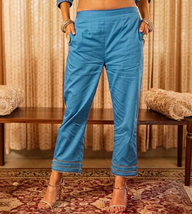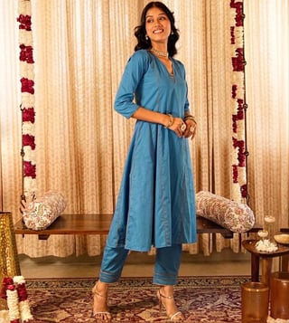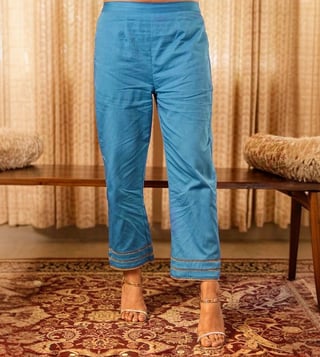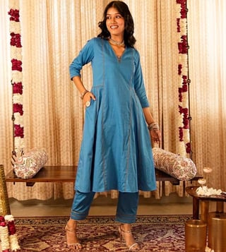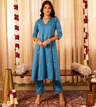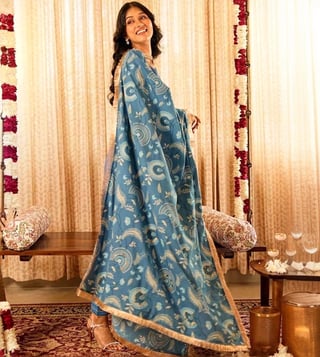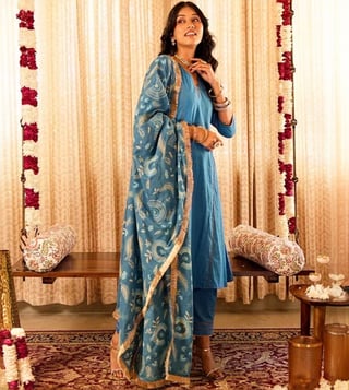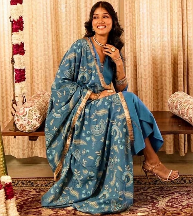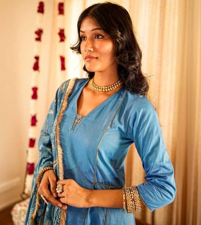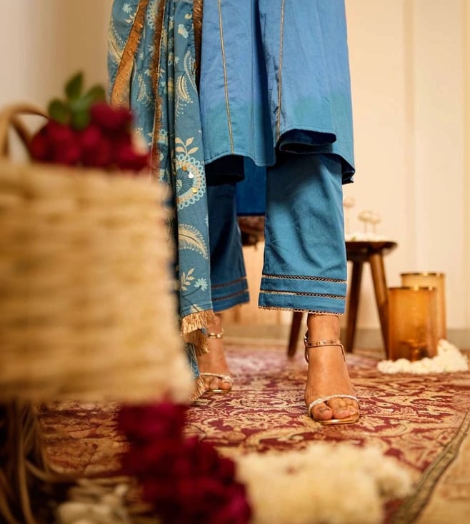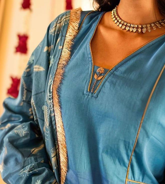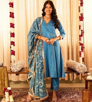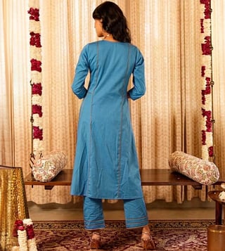 Step into elegance with our Solid Blue Panelled Anarkali Kurta paired with Straight Pants and printed dupatta, expertly crafted from 100% organic cotton. The set comes with gold piping and zari lace details. The dupatta elevates the look of the ensemble with lace border and sequin embroidery. This exquisite ensemble beautifully blends traditional design with contemporary flair, making it a must-have for any occasion.