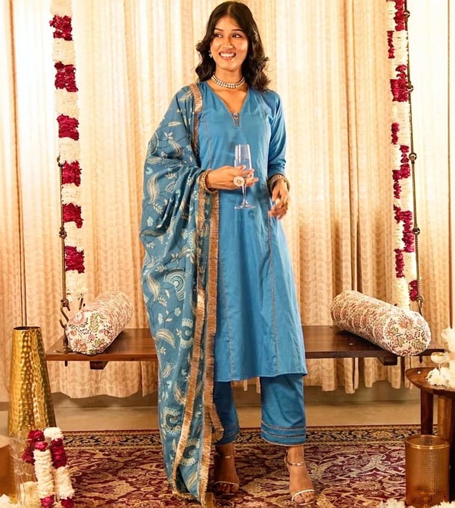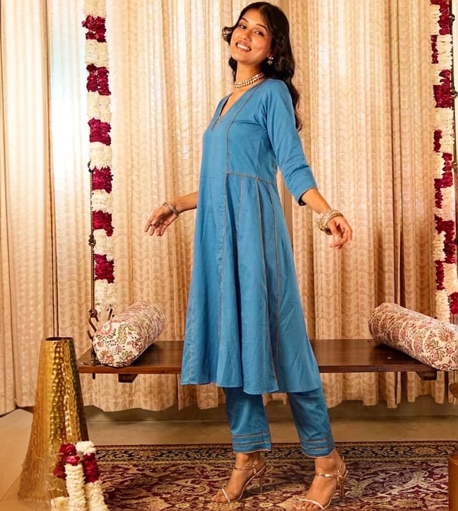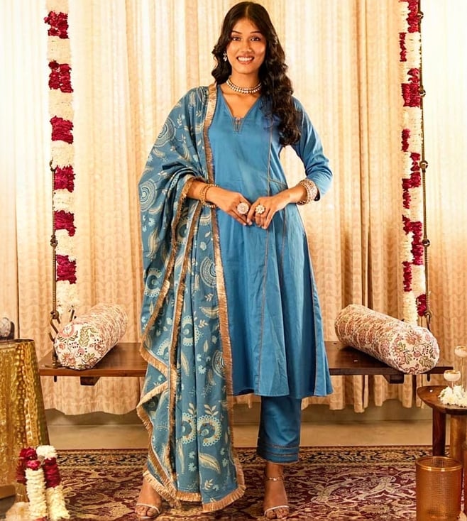 Akiso Blue Panelled Anarkali Kurta With Straight Pants And Printed Dupatta (Set Of 3)