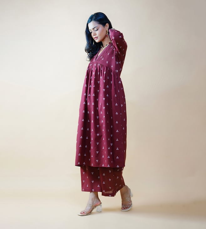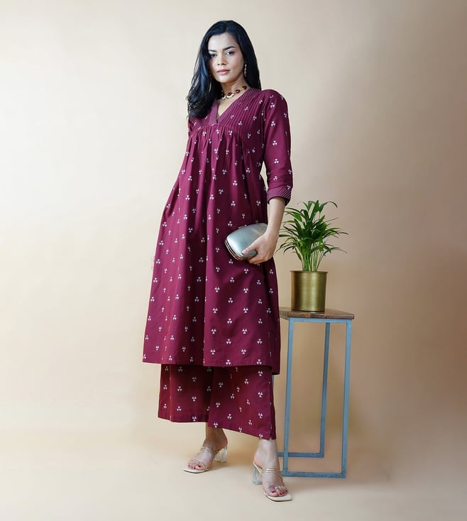 A symphony of style and comfort, this plum-colored kurta and flared pant set is a masterpiece of traditional Indian handloom. Crafted from 100% cotton with delicate embroidery, it exudes timeless charm. The V-neck kurta with 3/4 sleeves and long A-line silhouette is paired with wide-legged pants featuring pockets and a half-elasticized waistband for a perfect fit. Perfect for festive occasions or a chic dinner, this ensemble is a versatile addition to your wardrobe. (Model height: 5'7", wearing size small).