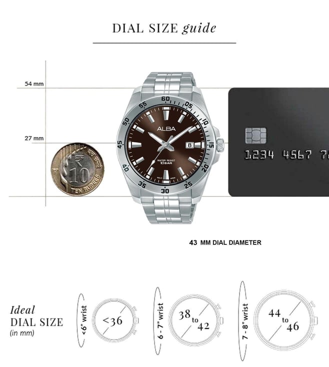 A sporty and stylish everyday watch, the Alba Active AS9V49X1 boasts a 43 mm stainless steel case, brown dial, and full metal bracelet. Driven by a dependable VJ42 quartz movement, it offers precise three-hand timekeeping plus date. With mineral glass and 10 bar water resistance, its built for versatility whether youre at work, casual outings, or light water activities.