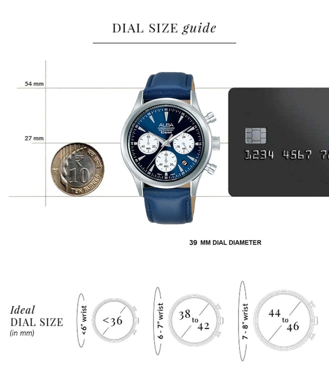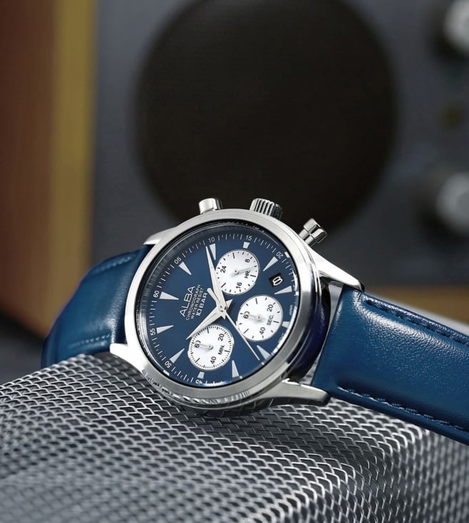 The Alba AT3K57X1 is a refined mens chronograph featuring a textured blue dial with contrasting white subdials, housed in a 39mm stainless steel case. Powered by the Alba VD53 quartz movement, it offers a 60-minute chronograph, date display, and 100-meter water resistance. The genuine leather strap adds a touch of sophistication, making it suitable for both formal and casual occasions.