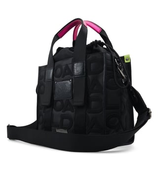 A distinctive yet subtle. monogram pattern defines this carry-all satchel. This one boasts tasteful colour-blocking and a drawstring closure. Get ready to turn heads and shine bright wherever they go.