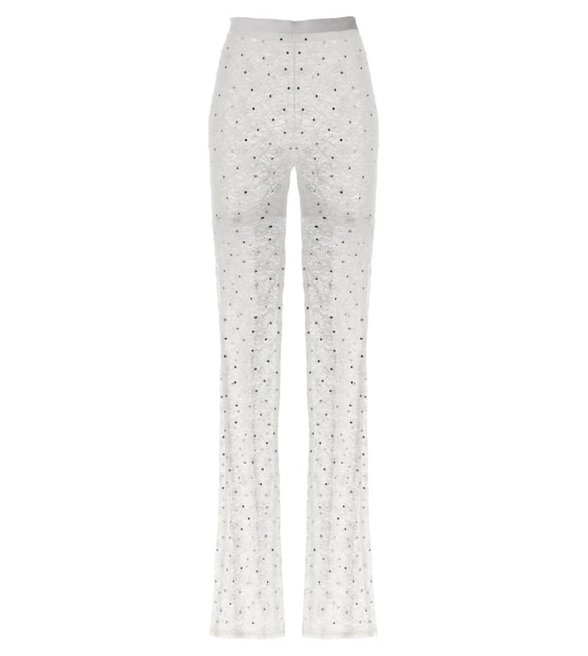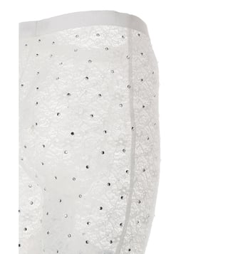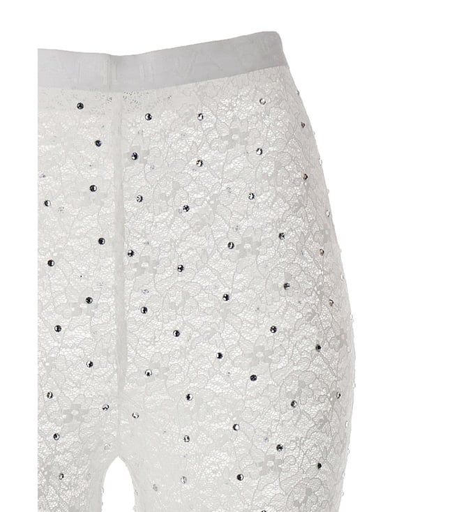 Elevate your wardrobe with the Alessandra Rich White Embellished Skinny Fit Trackpants. Designed with lace leggings with rhinestone appliqu and elastic waistband. true to size fit, these trousers combine comfort and sophistication for everyday wear. Products purchased from Darveys are supported exclusively by the warranty/exchange policies of Darveys and its partner boutiques. Brand owners and their channel partners are not responsible for exchange/warranty services for items purchased through Darveys.