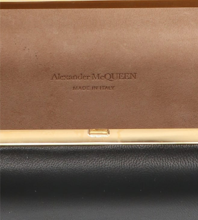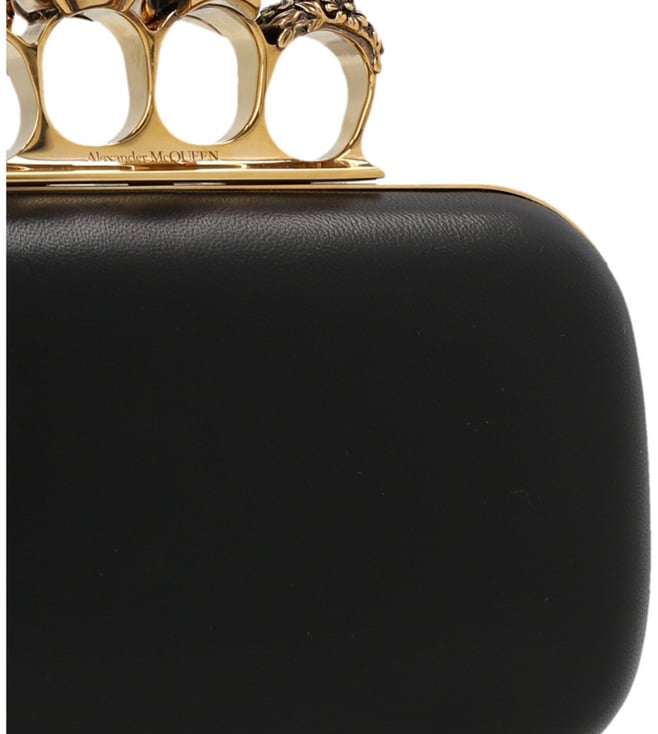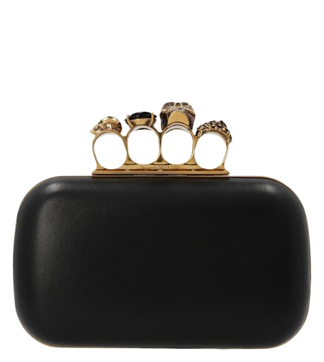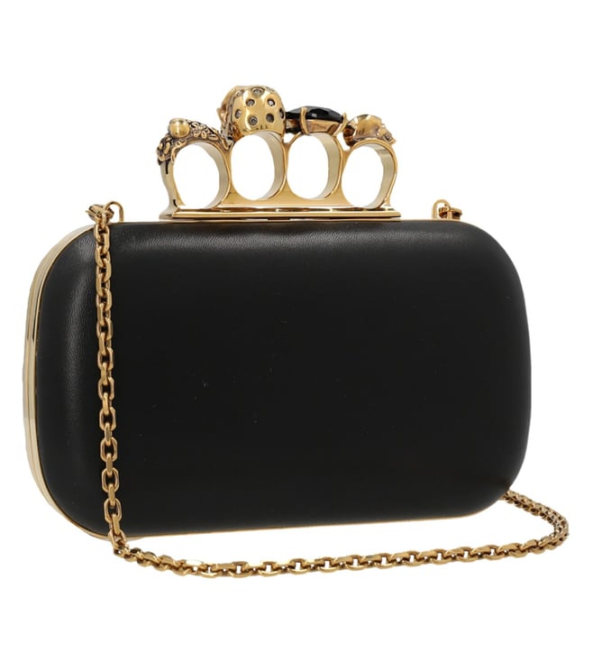 Skull four ring black nappa leather clutch featuring a skull and a handle with four antiqued gold finish rings with swarovski crystals, a removable chain shoulder strap and metal brass accessories with an antiqued gold finish. Products purchased from Darveys are supported exclusively by the warranty/exchange policies of Darveys and its partner boutiques. Brand owners and their channel partners are not responsible for exchange/warranty services for items purchased through Darveys.