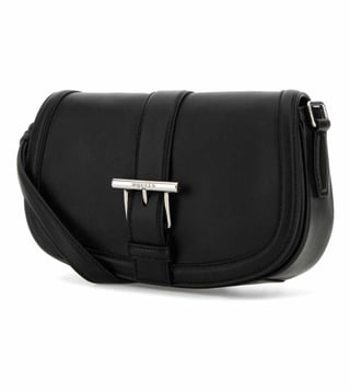 Silver-finished t-bar on the front beltone central compartment and one open back pocketinternal zip pocket1 detachable and adjustable crossbodystrap + 1 detachable non-adjustable shoulder strapmagnet fasteningbrass hardware with antique silver finishingblack canvas lining.