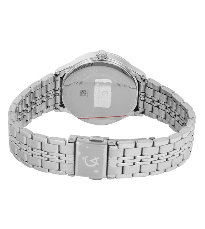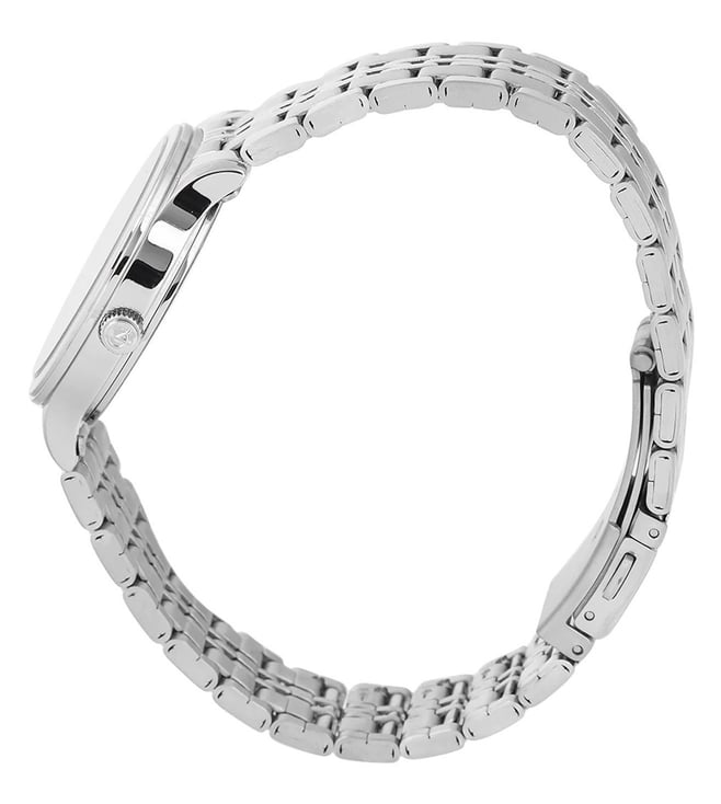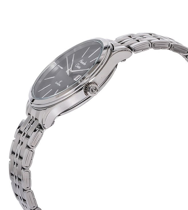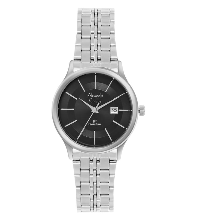 Add a classy touch to your attire by wearing this women's analog watch from the collection by ALEXANDRE CHRISTIE. The silver round dial is protected by a mineral glass. It features crown for time adjustment. The stainless steel strap flaunts a black hue that accentuates the look of the watch. Besides, it is completed with a fold-over clasp with double push button safety clasp to ensure a secure fit on the wrist.