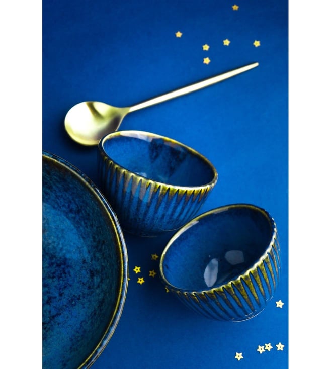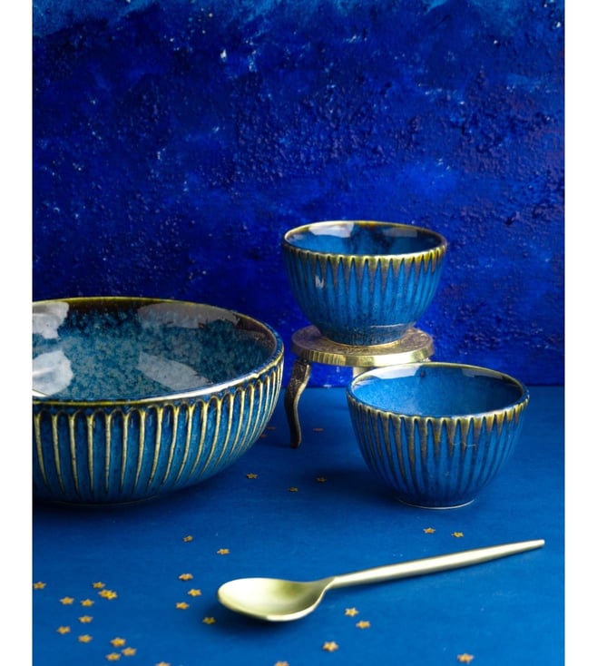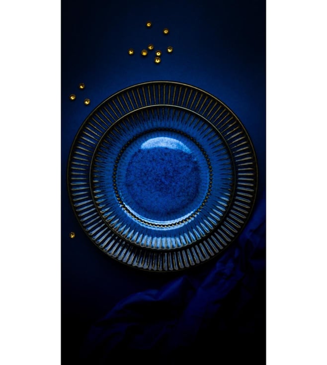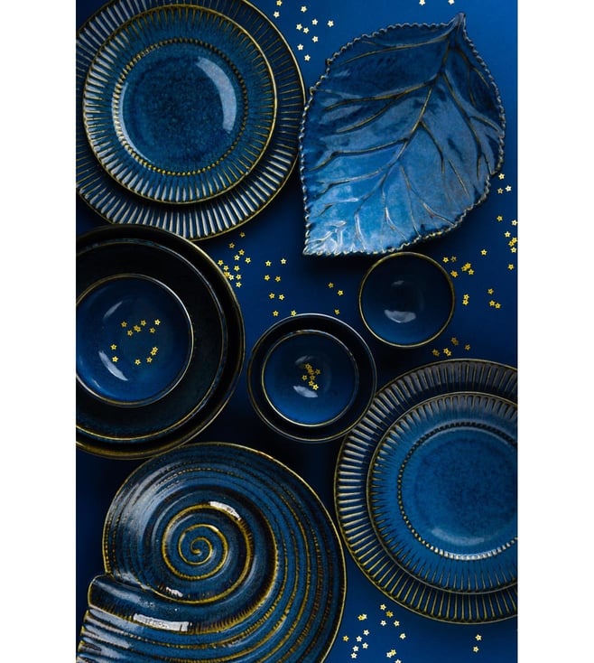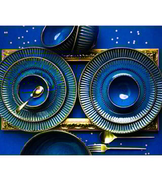 Taking inspiration from the luscious feature of the blue macaw, this dinner set is vivacious and elegant with an Arabic theme. The set includes 82 pieces. It has 18 dinner plates, 18 salad plates, 18 soup bowls, 18 portion bowls, 3 serving bowls, 2 serving bowls, 2 pasta platters, 1 shell platter and 2 oval platters. Disclaimer: All other items in the image are only for display purposes and will not be a part of the delivery content. Product colour may slightly vary due to photographic lighting sources. Country of Origin - India. It is made of ceramic.