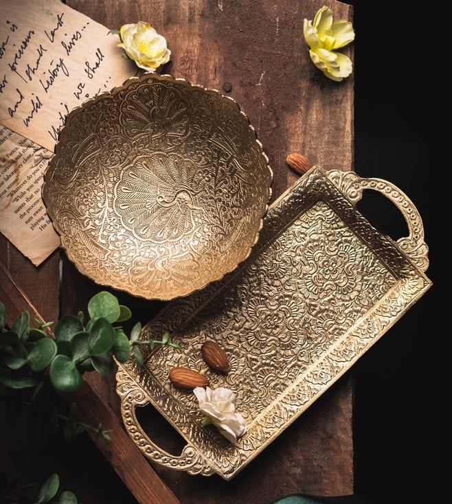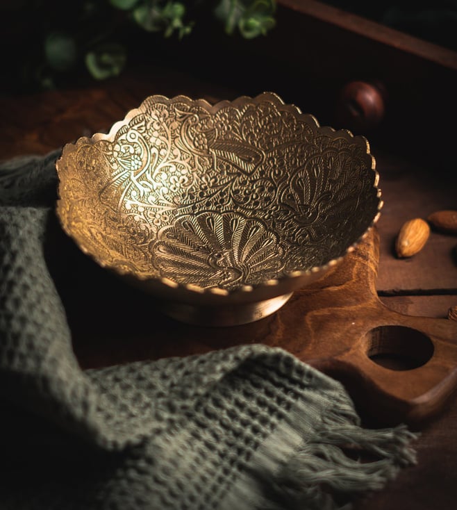 Add a touch of sophistication to your home decor with the Amalfiee Brass Premium Peacock Bowl. Featuring a beautiful golden peacock design, this elegantly crafted bowl is perfect for adding a lavish touch to any space. Sturdy and timeless, its unique design will ensure it stands out from the crowd. Spice up your decor with this striking and majestic peacock bowl. Disclaimer: All other items in the image are only for display purposes and will not be a part of the delivery content. Product colour may slightly vary due to photographic lighting sources. Country of Origin - India.