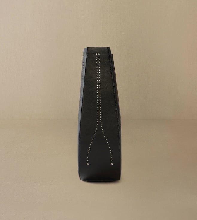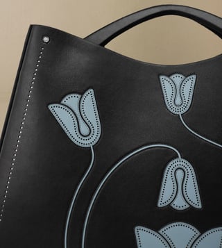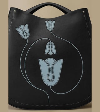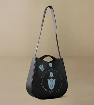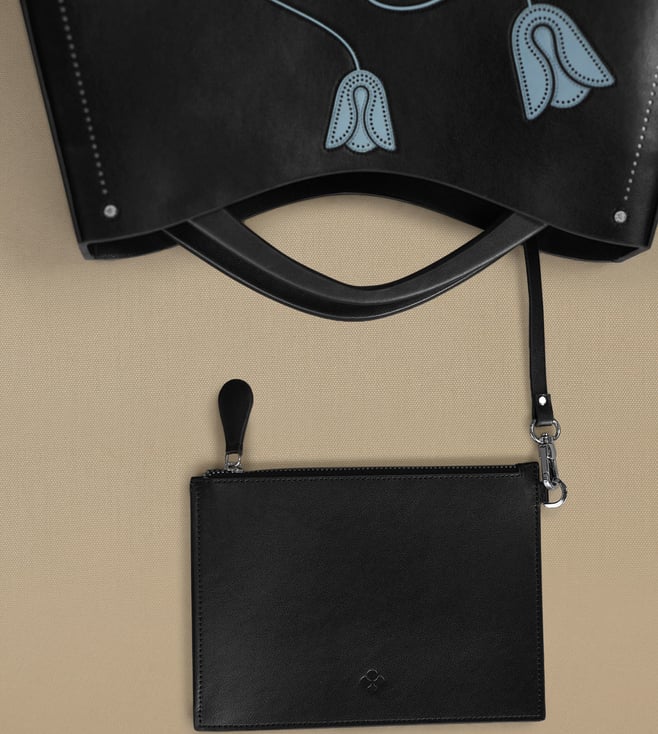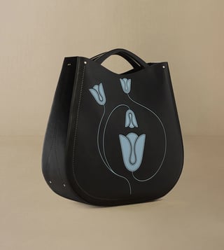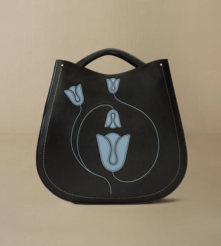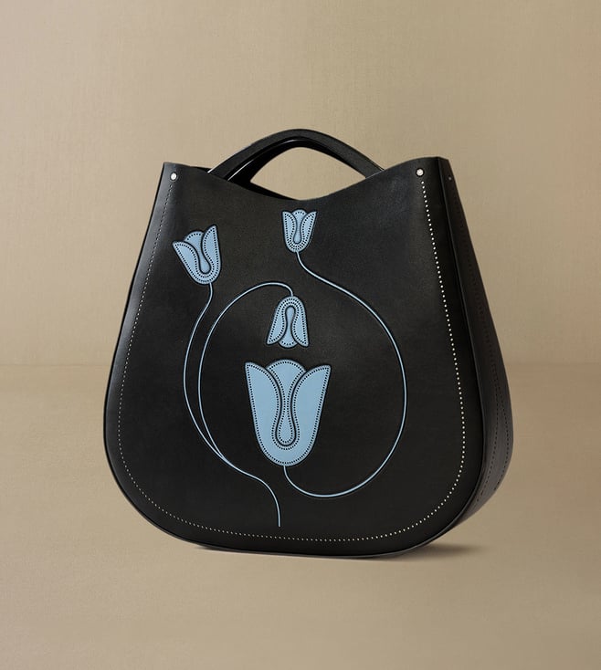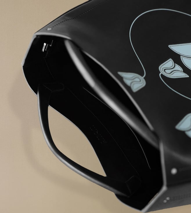 Meet Mesina, a sleek and sophisticated tote that holds a quiet confidence. Made of butter-soft black faux leather with a cheerful floral inlay in dusky blue, perforation on the edges add charming character. Mesina's detachable shoulder strap and pouch bring order and practicality to your day.