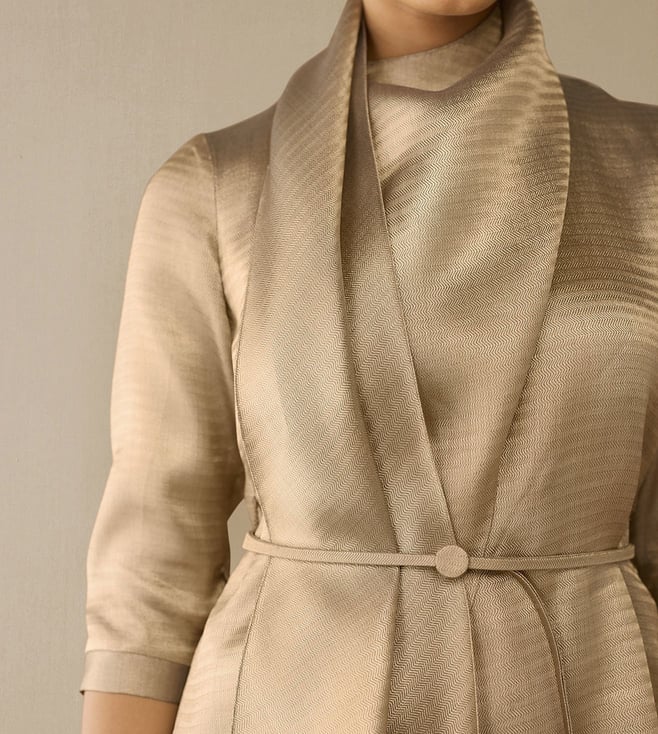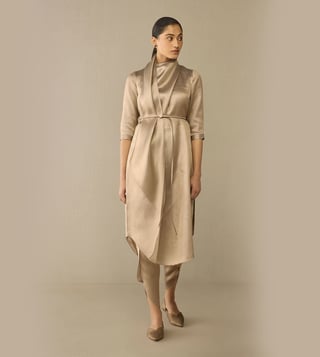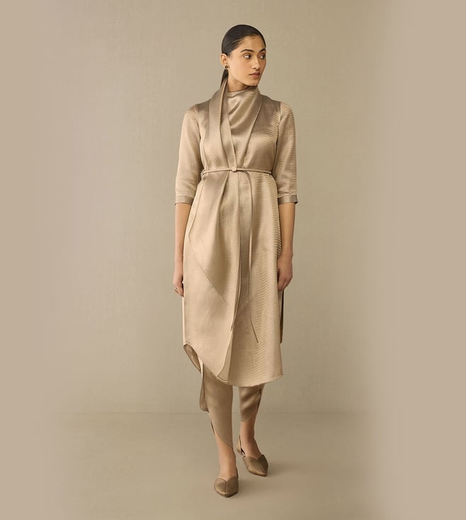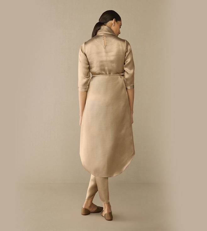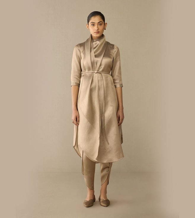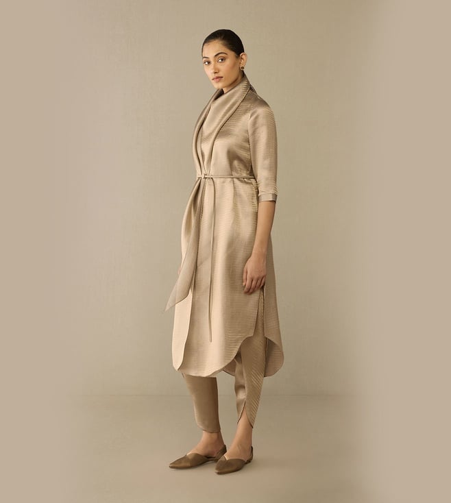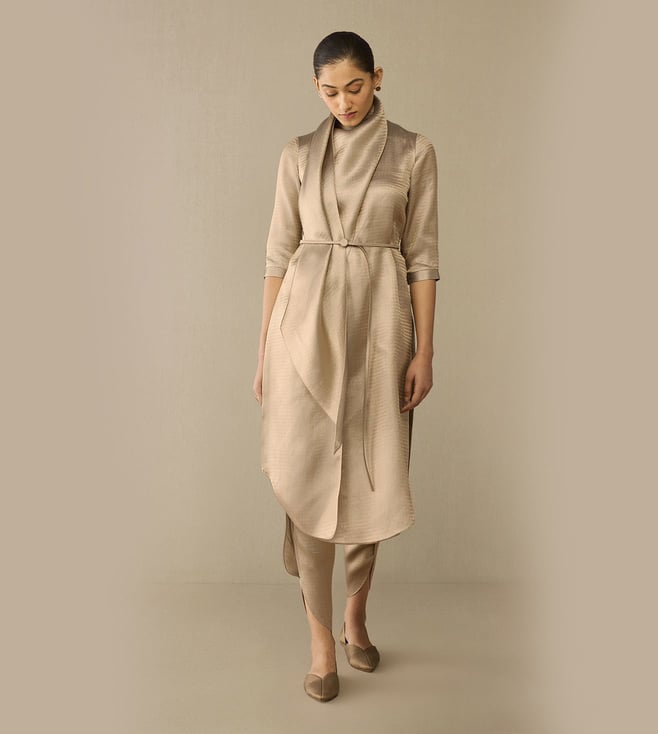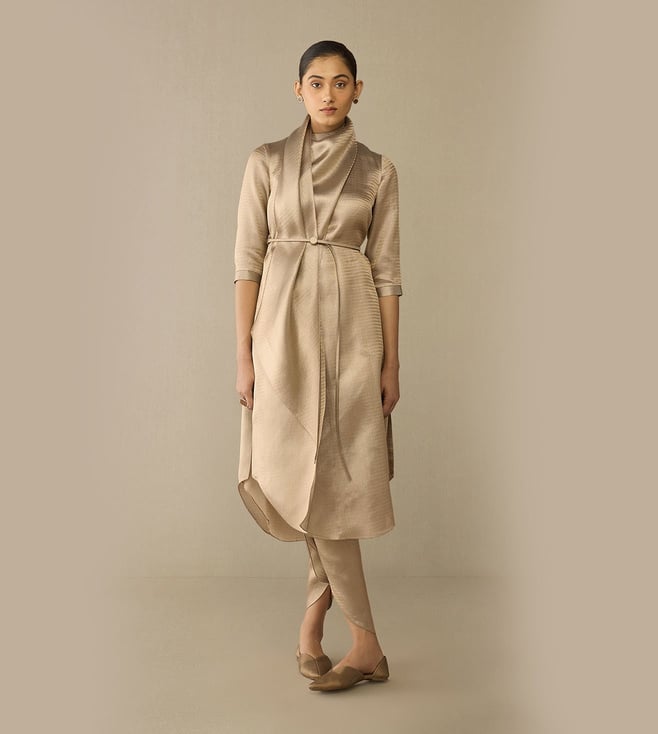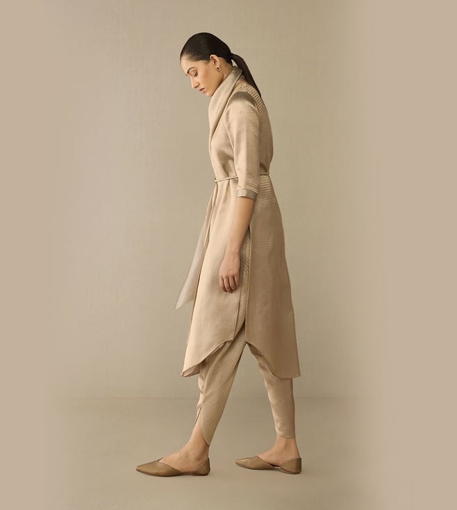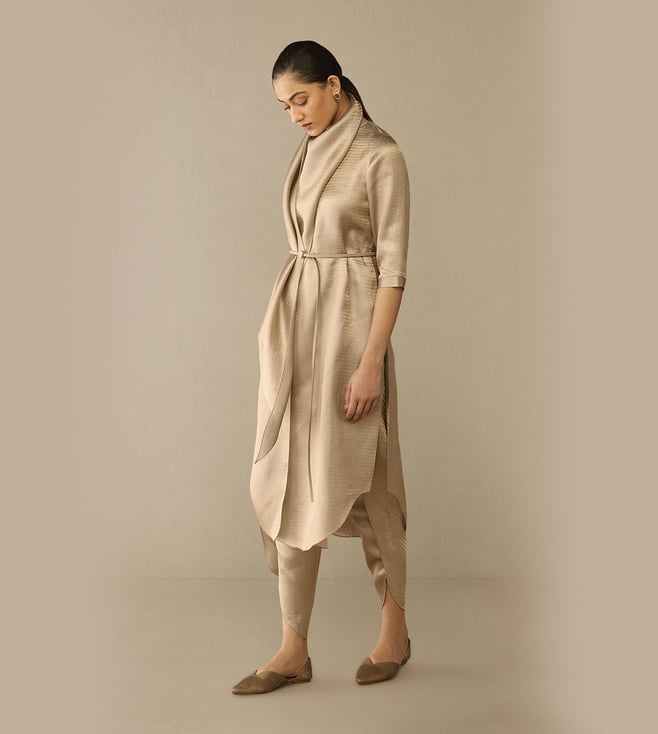 Sweeping golden brocade drapes itself around the neck of the tunic, providing our Avaia tunic set with a unique silhouette. The matching dhoti inspired pants feature slight slits up the shin, keeping the signature drape of this set, and the long belt that comes with the set ties the whole outfit together. Pair Avaia with our Ninah mules and Ruya clutch for a golden look that turns heads at your next dinner party.