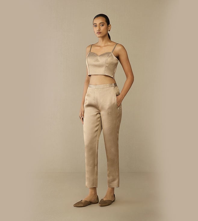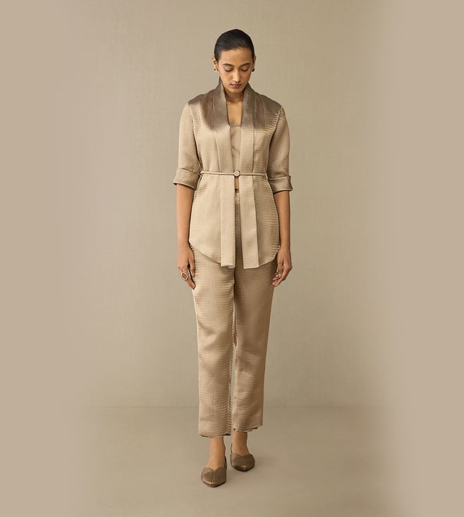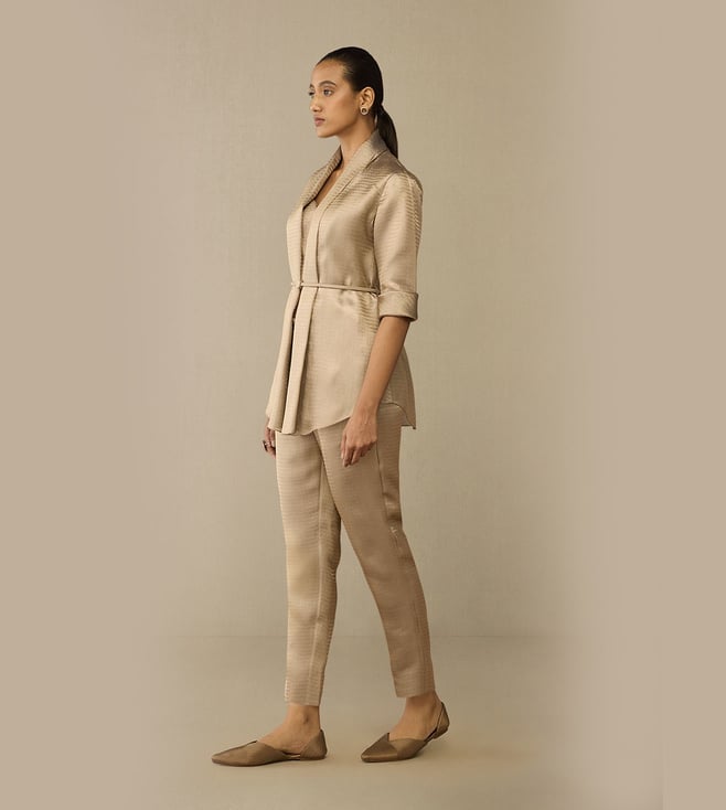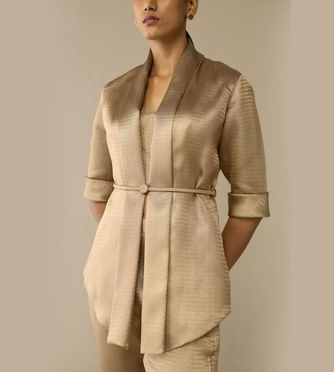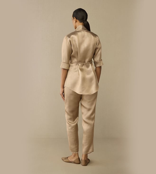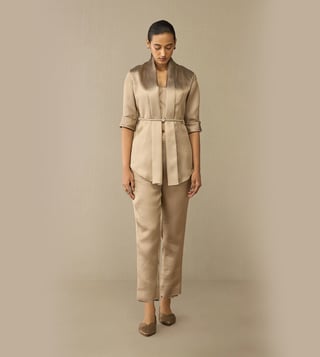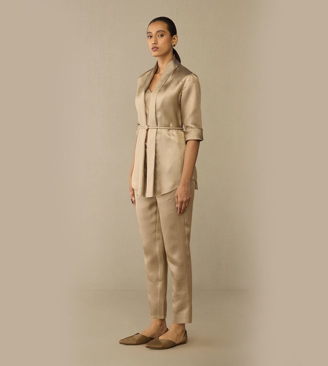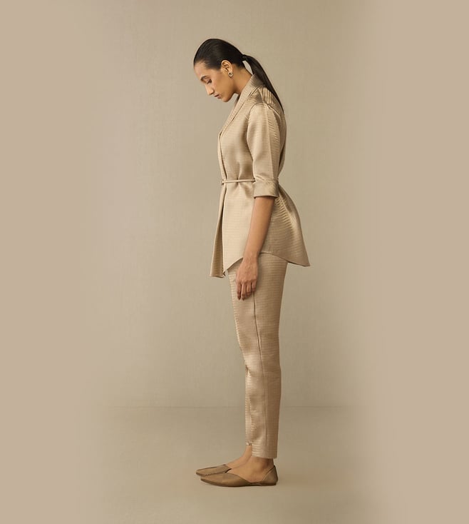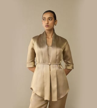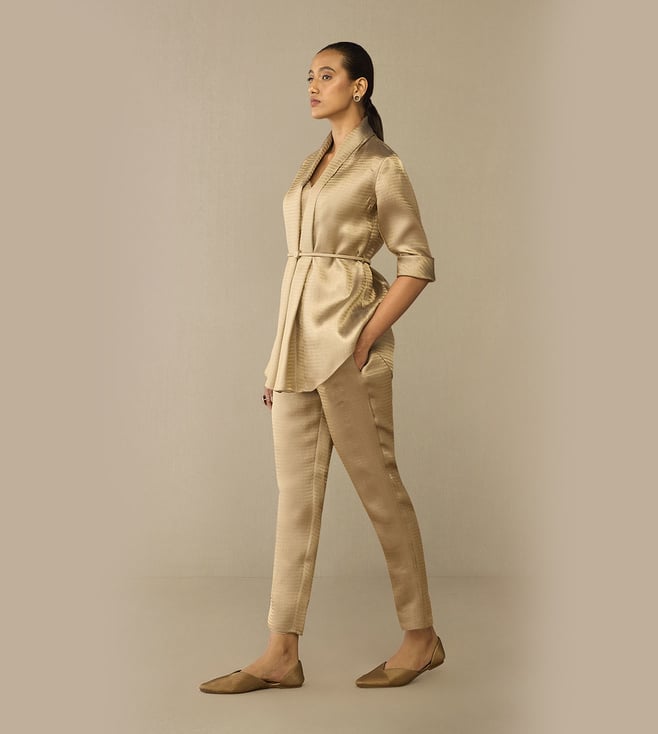 Idalia, our evening set in golden brocade, is made for the space in between seasons. The brocade folds over to form clever lapels, the golden fabric flowing like liquid. A sleek enamel-buckled belt cinches the waise, adding just the right touch of structure.