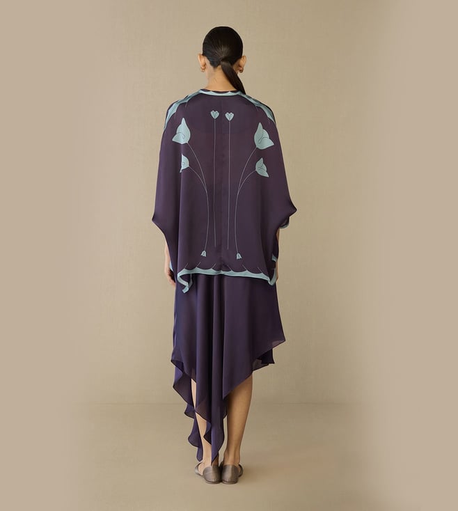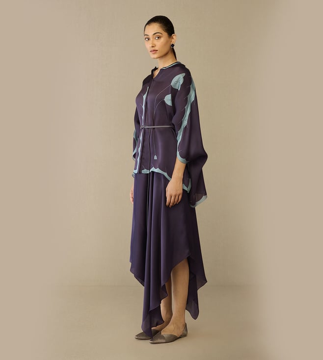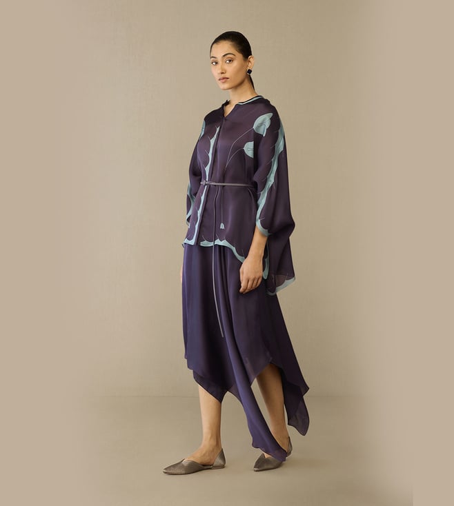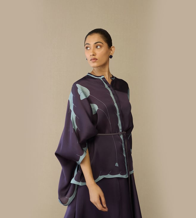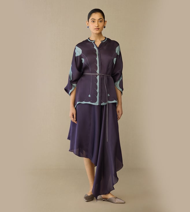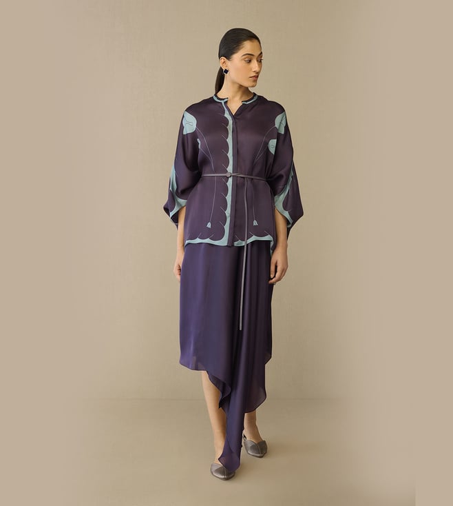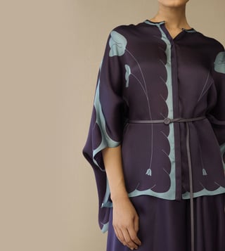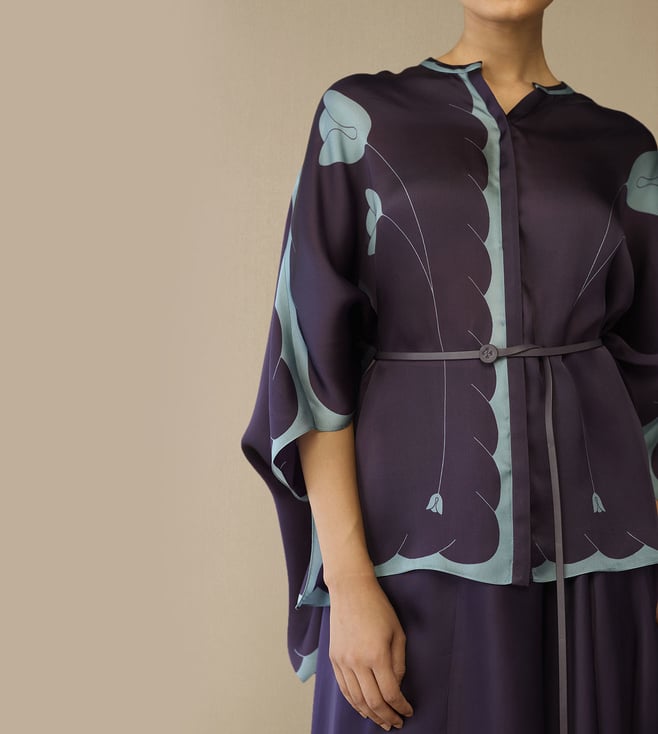 The Refa shirt set is an ode to quiet refinement. With its kaftan-inspired shirt in deep purple satin organza, adorned with intricate ice blue prints, it carries an understated charm. Delicate ice blue blooms pattern the shirt, cinched at the waist with an embossed faux leather belt.
