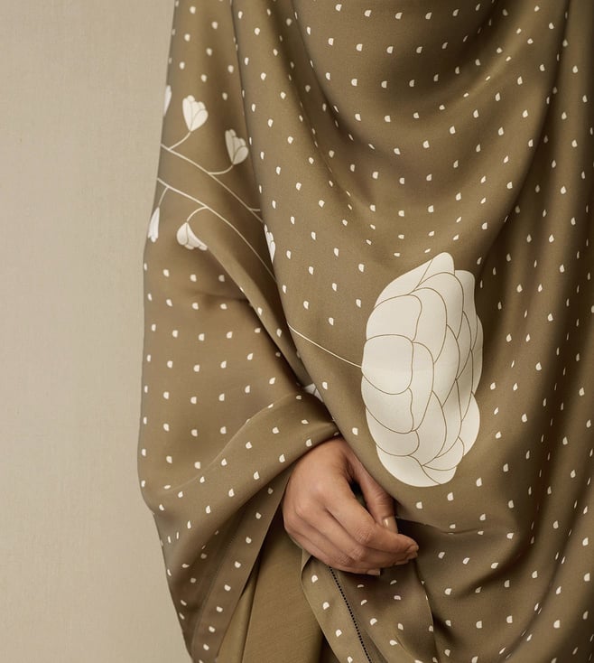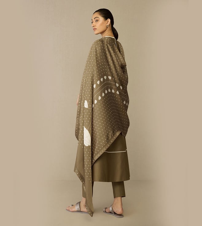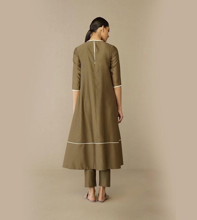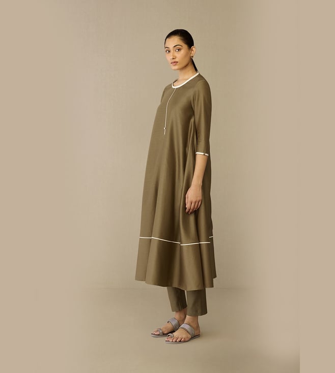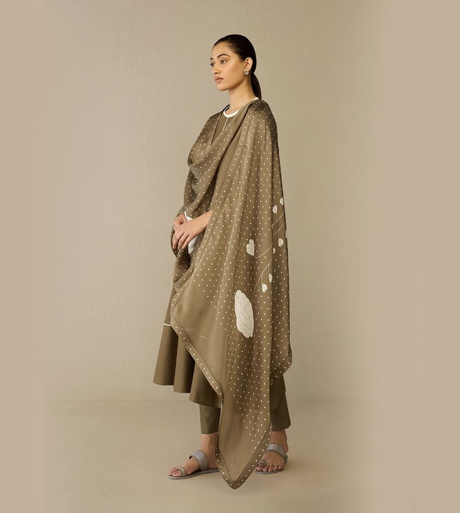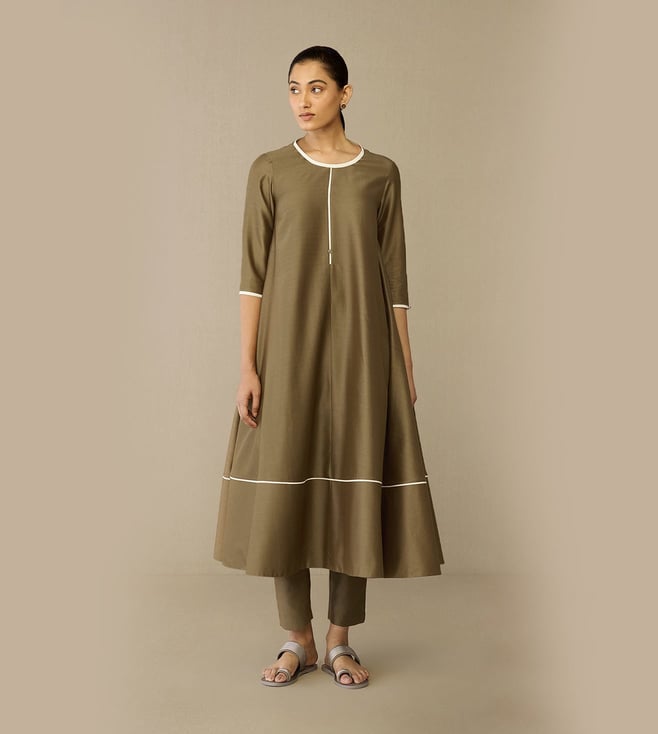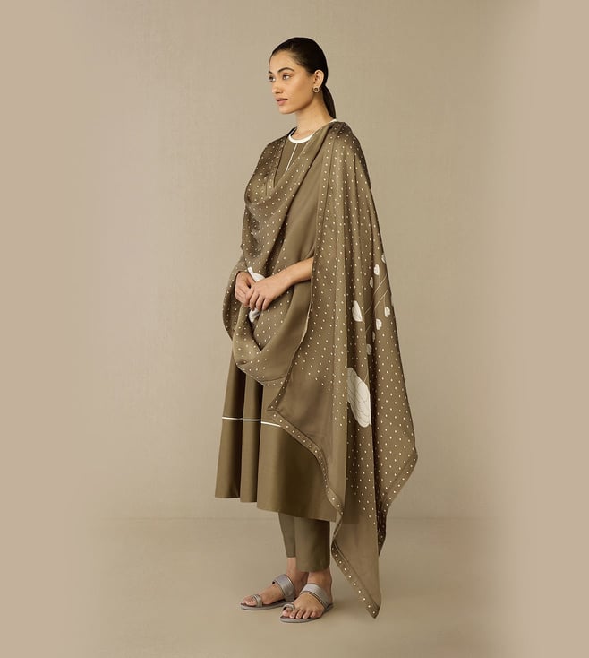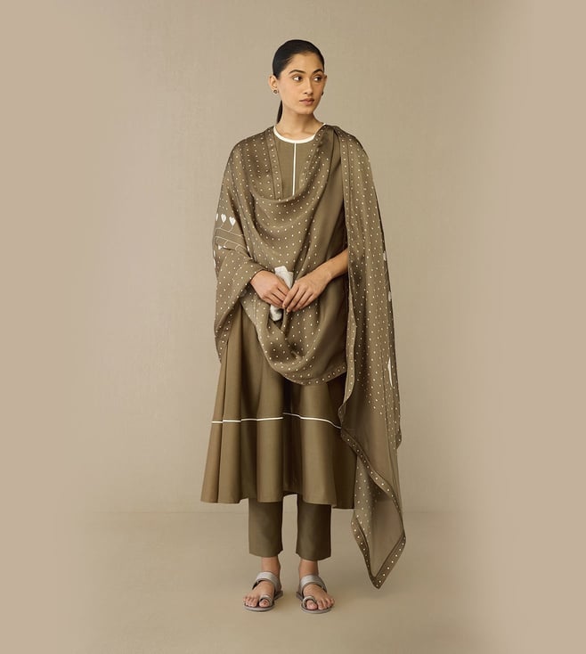 The taupe cotton silk kurta of the Erisha set flares in a smooth line, the elegance of the lines pairing with the simplicity of the design. Charming little enamel buttons sit on delicate ivory piping edging the neckline and cuffs of the sleeves, as a dupatta, light as silk yet heavy in imagery features ivory blooms and half-moons.