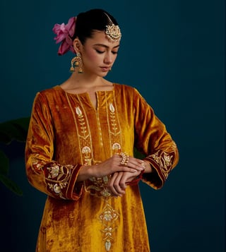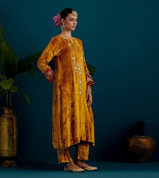 Discover The Crafted From Luxurious Satin, Anantaa By Roohi Trehan Mustard Velvet Comfort Fit Kurtas This Dress Offers Elegance And Versatility In Vibrant Hues. Disclaimer: All Other Items In The Image Are Only For Display Purposes And Will Not Be A Part Of The Delivery Content. Product Colour May Slightly Vary Due To Photographic Lighting Sources. Country Of Origin - India.