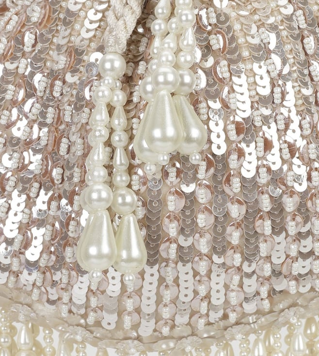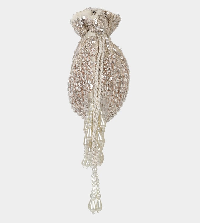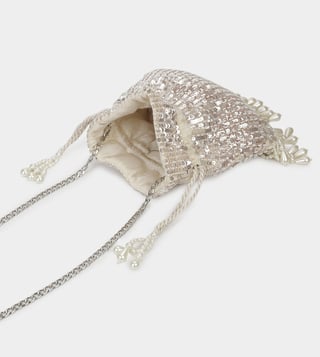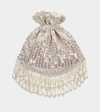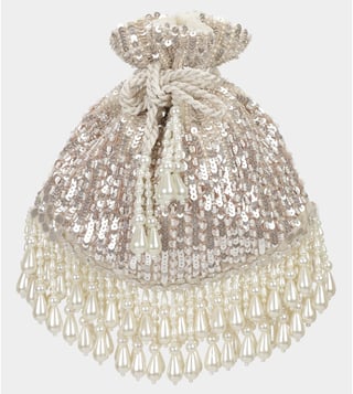 Make your outdoors all the more fun and fashionable with this potli bag made using viscose. Handcrafted, it has sequin embroidery all over and pearl latkans at the bottom and the dori. It comes with a detachable sling chain. Disclaimer: Product colour may slightly vary due to photographic lighting sources. Country of Origin - India.