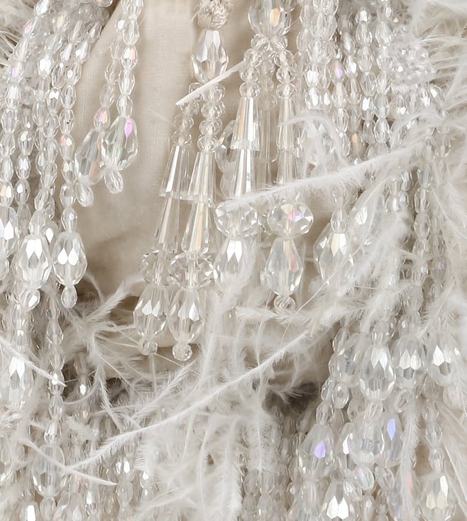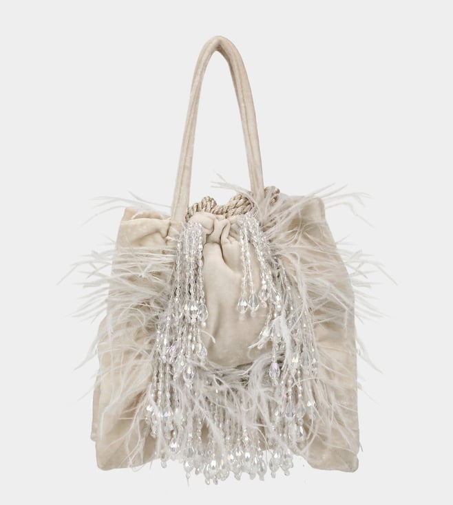 Get noticed for all the good reasons with this potli bag made using viscose. The beauty of this handcrafted bag lies in the tone-on-tone feathers and crystal latkans used to amplify its look. It comes with a handle. Disclaimer: Product colour may slightly vary due to photographic lighting sources. Country of Origin - India.