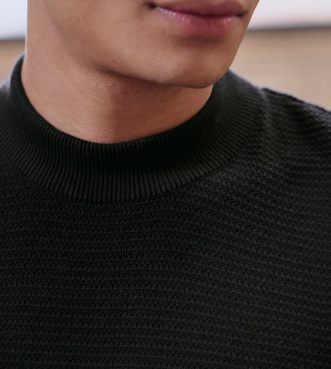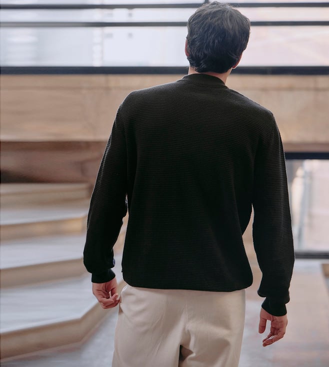Black Structured Fabric Cotton Blend Flat Knit Regular Pullover