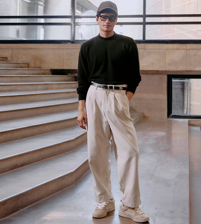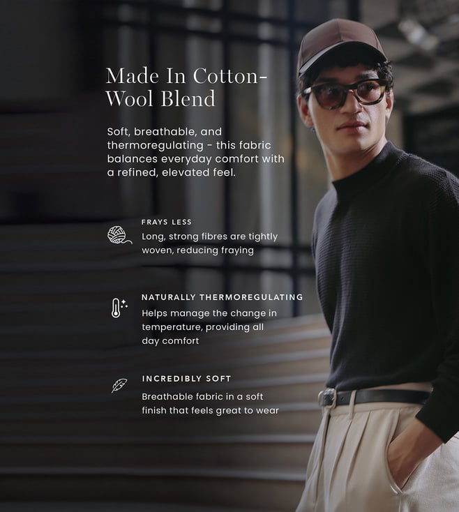 Where structure meets serenity. This mock-neck pullover in a cotton-wool blend delivers subtle texture, breathable warmth, and elevated design discipline. Tailored for form, made for freedom.