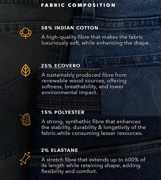 Introducing PureDenims by Andamen. Crafted from a premium cotton blend, this classic pair of jeans is luxuriously soft, incredibly durable, and perfect for the Indian climate. Featuring a rich shade in a classic wash, with a structured drape, these jeans add a timeless layer to your style. Meticulously designed for the modern Indian man, they offer the right amount of room in the hips and thighs for guaranteed comfort. The tapered calves refine the silhouette, adding subtle sophistication to the garment. Crafted to last for years to come. Proudly made in India.