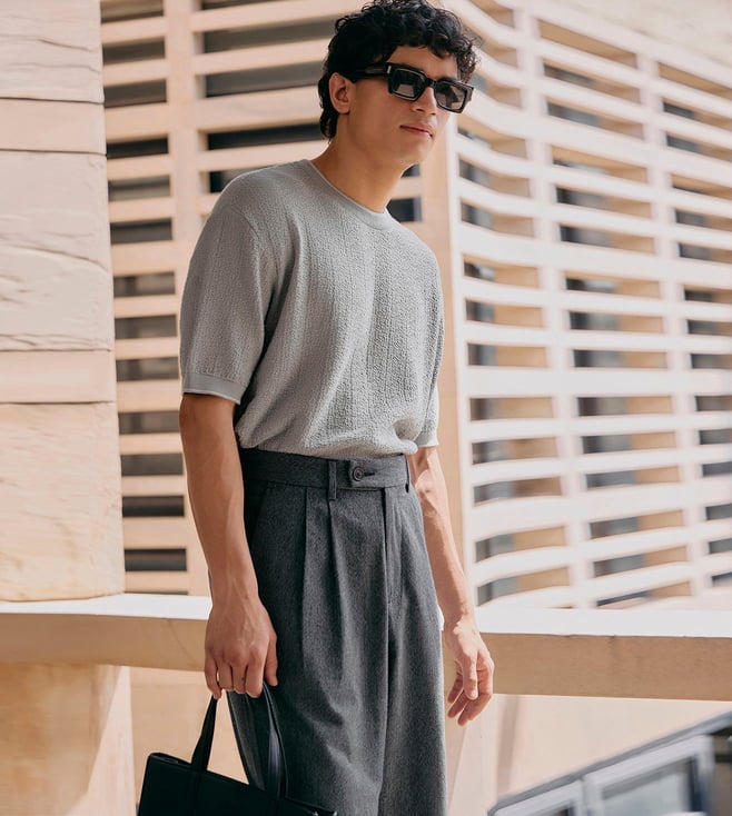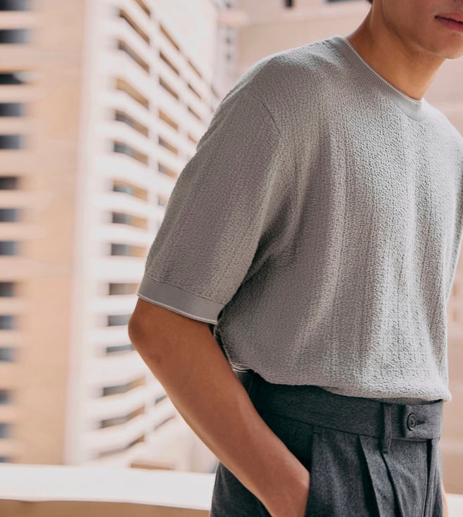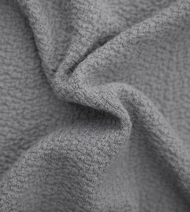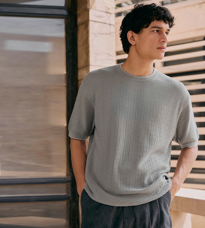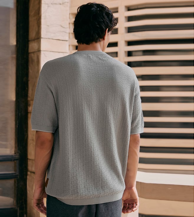 Grey Structured Fabric Cotton Flat Knit Relaxed Crew Neck