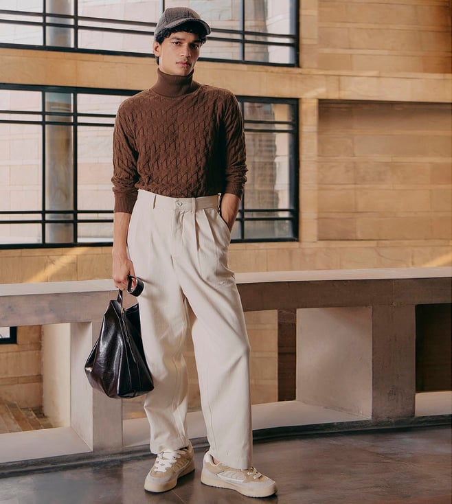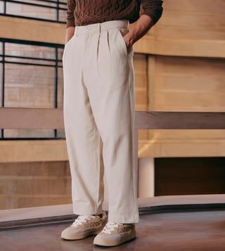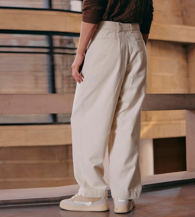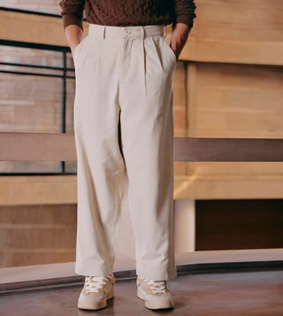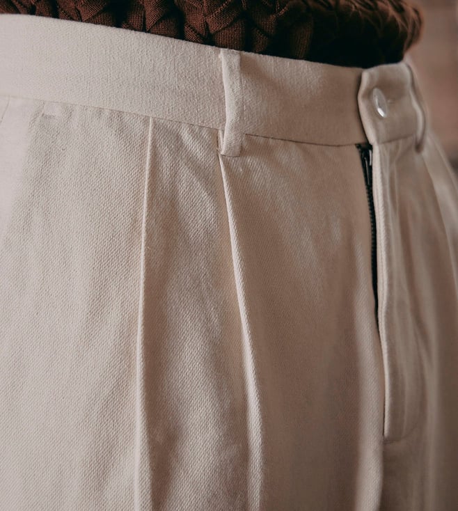 Minimalism, reimagined for motion. These cotton pleated trousers are cut in a relaxed, straight-loose fit for fluid structure and everyday comfort. Subtle detailing and a soft peach-finish fabric make them a refined statement in quiet luxury.